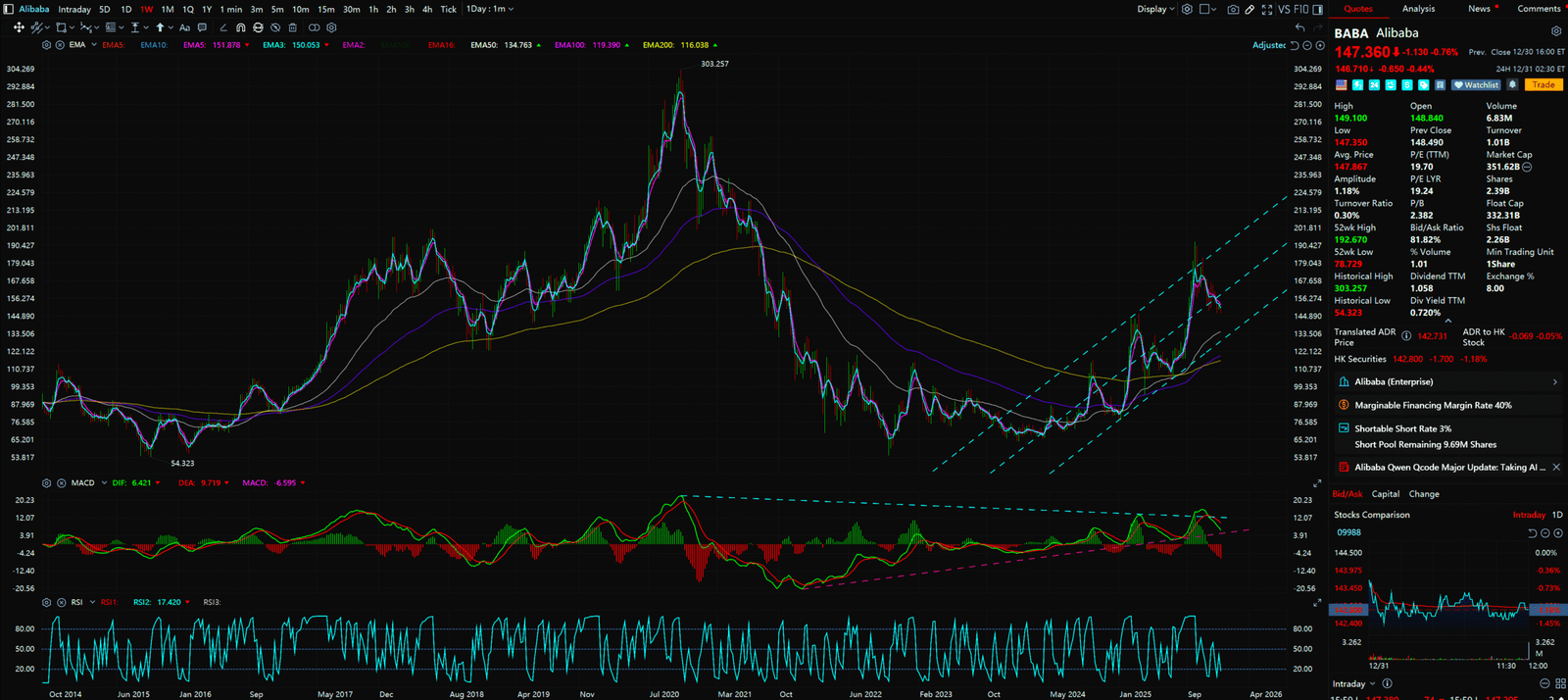 - Chart Decode: BABA formed a massive Double Bottom (W-Bottom) near $70. It is now testing the long-term downtrend line.