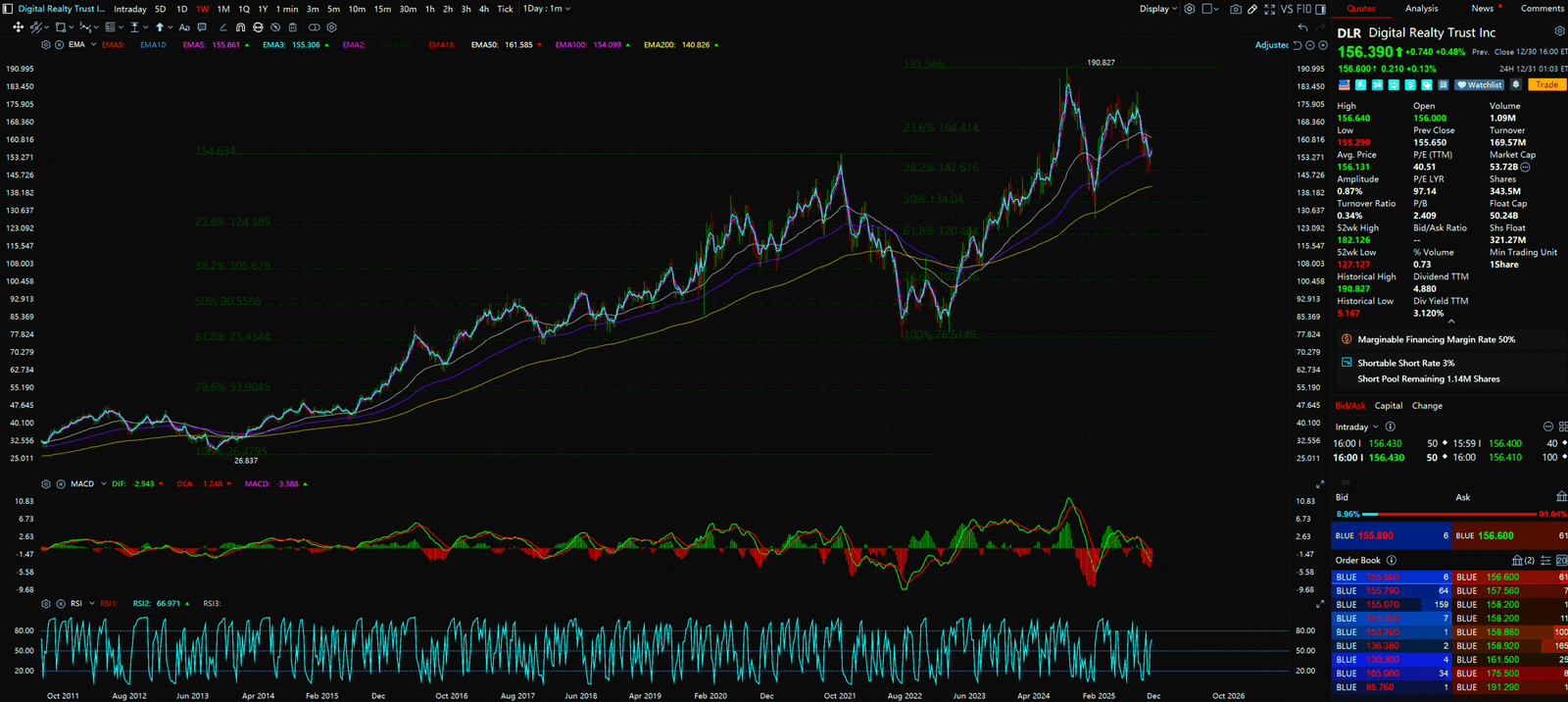 - Chart Decode: Look at DLR. This is a classic Leader Structure. It is stronger than other REITs because it is tethered to AI. Price is grinding up the EMA 50 without deep drawdowns.