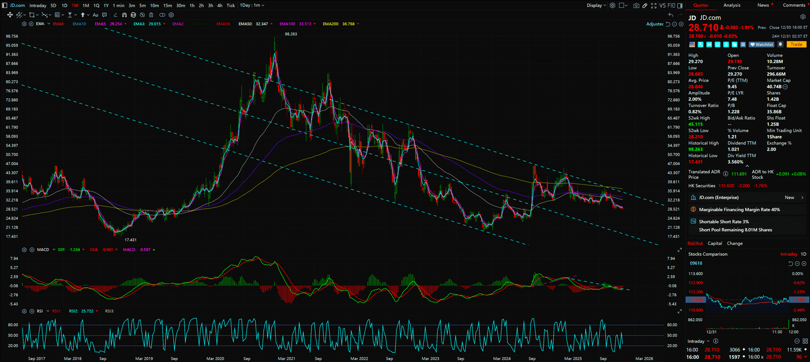 - Chart Decode: JD fell hard, but the Falling Wedge is a bullish reversal pattern.