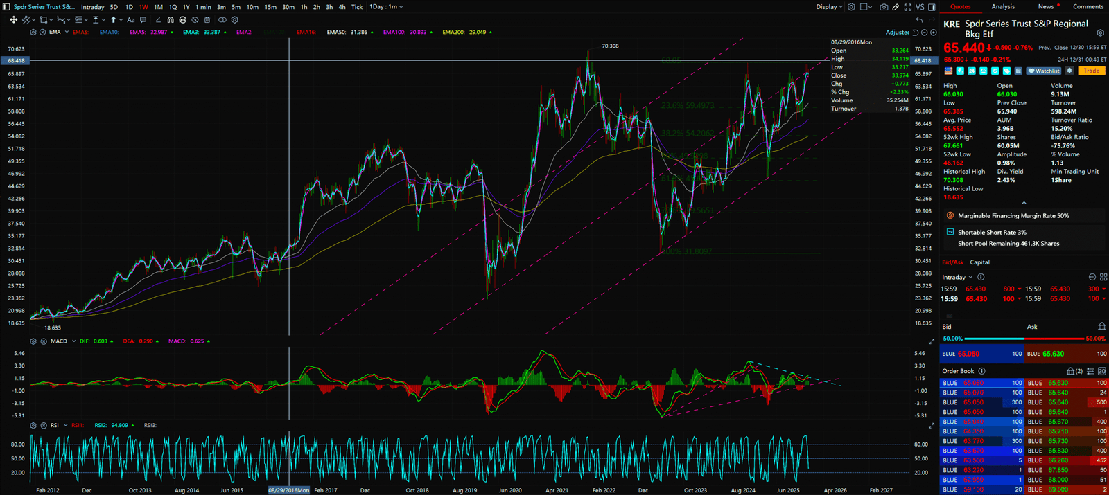 - Chart Decode: KRE has formed a textbook Inverse Head and Shoulders. The right shoulder is higher than the left, indicating strengthening buying pressure. Currently testing neckline resistance.