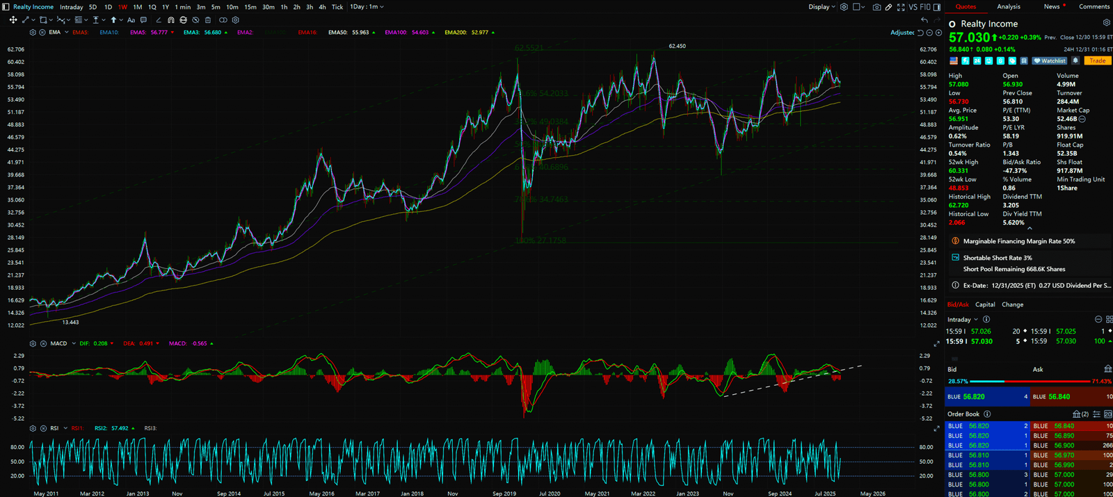 Realty Income (O) and American Tower (AMT). Their business model is Triple Net Lease—the tenant pays taxes, insurance, and maintenance. O is “The Monthly Dividend Company,” raising dividends for 25 years straight. Buying this is like buying an inflation-protected bond with upside.