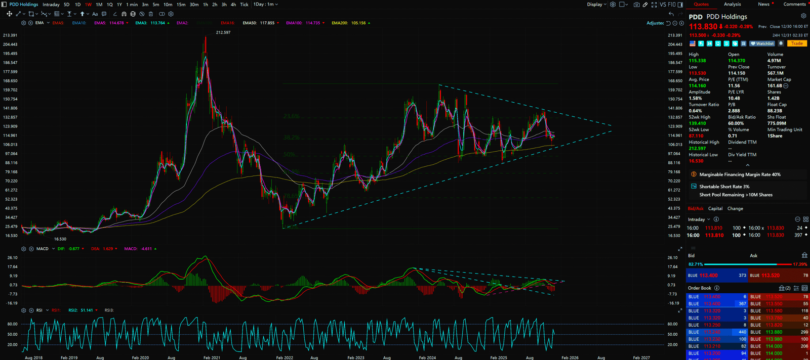 - Chart Decode: PDD is the strongest of the bunch. Temu’s expansion supports the price. The chart shows it digesting gains.