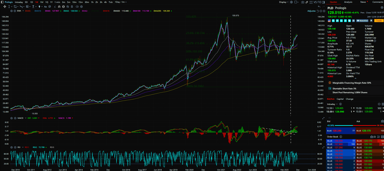 - Chart Decode: PLD has undergone a long correction and is now building a massive Rounding Bottom. Moving averages are aligning bullishly (EMA 20 > 50 > 200).