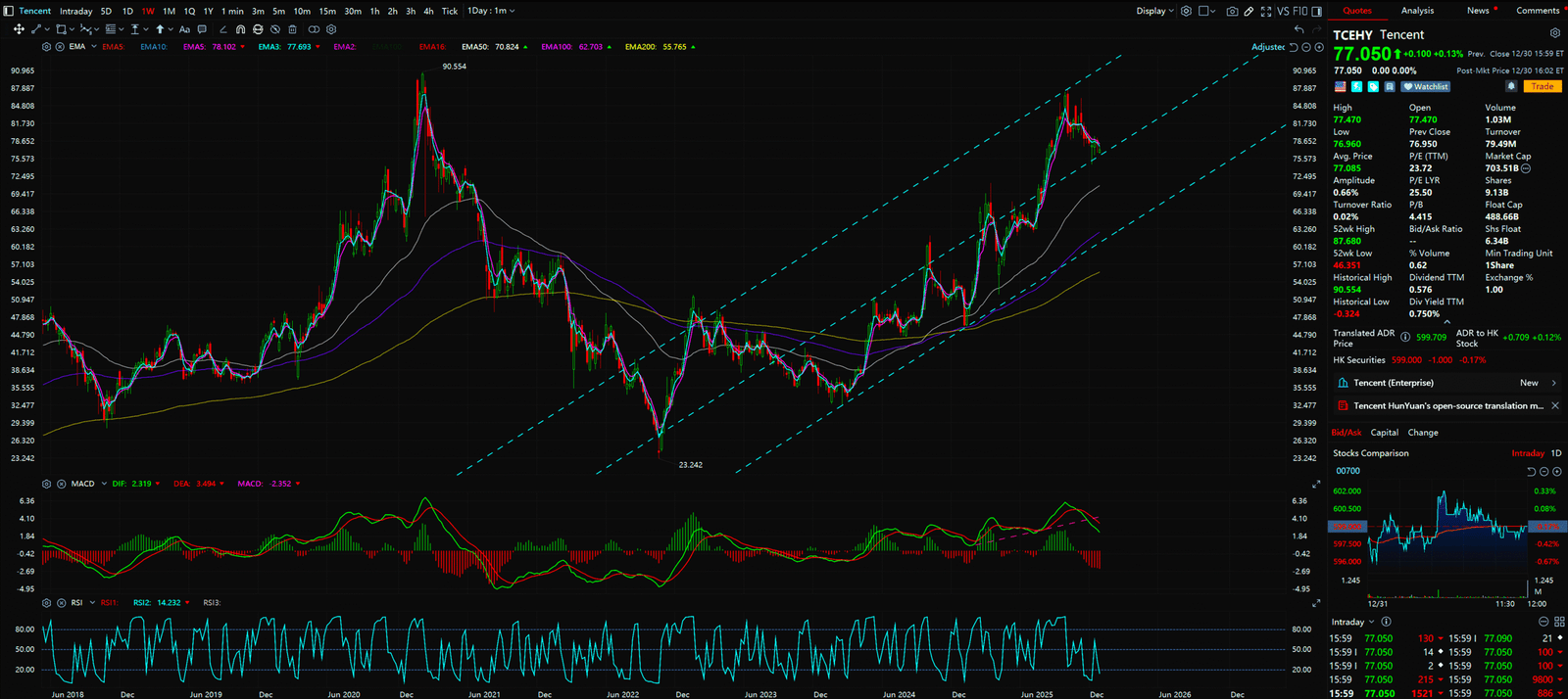 - Chart Decode: Tencent is steadier than BABA, showing a slow grind upwards.