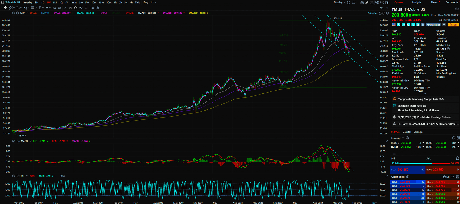 - Chart Decode: TMUS is different; it’s a growth stock. The chart is a perfect uptrend, consistently making new highs.