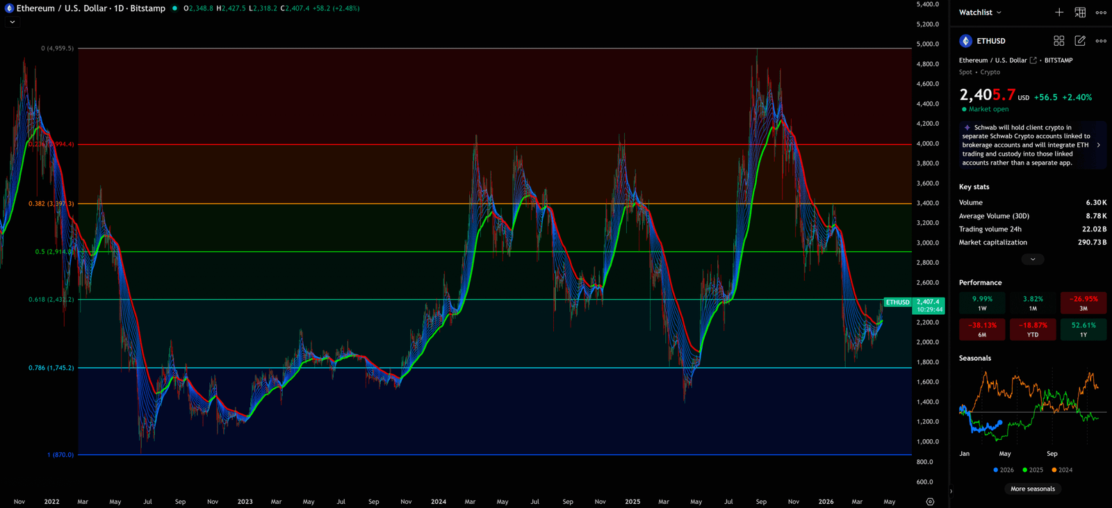 The first thing that catches the eye on this chart are the multiple colored radiating lines extending from the November 2021 all-time high—this is the Gann Fan, invented by legendary trader W.D. Gann. Gann theory posits that market movements are governed by specific geometric angles, with the 1×1 angle (a 1:1 ratio of time and price) being the most critical bull/bear dividing line. The chart shows that the ETH price is currently engaged in a fierce struggle near the 1/2 angle line (around the 2,400 – 2,500 USD zone). If it can hold above the 1/2 line, the next long-term target will be challenging the steeper 1/3 or even 1/4 angle lines above.