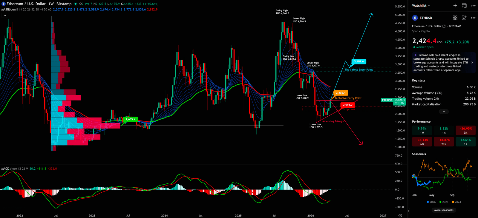 Notice the red Ascending Triangle structure drawn on the chart. ETH recently found strong support near 2,091.7 USD (a Higher Low following the Swing Low at 1,755.5 USD) and is now challenging the crucial 2,456.4 USD resistance. An Ascending Triangle is a bullish consolidation pattern that typically signals an upward breakout.