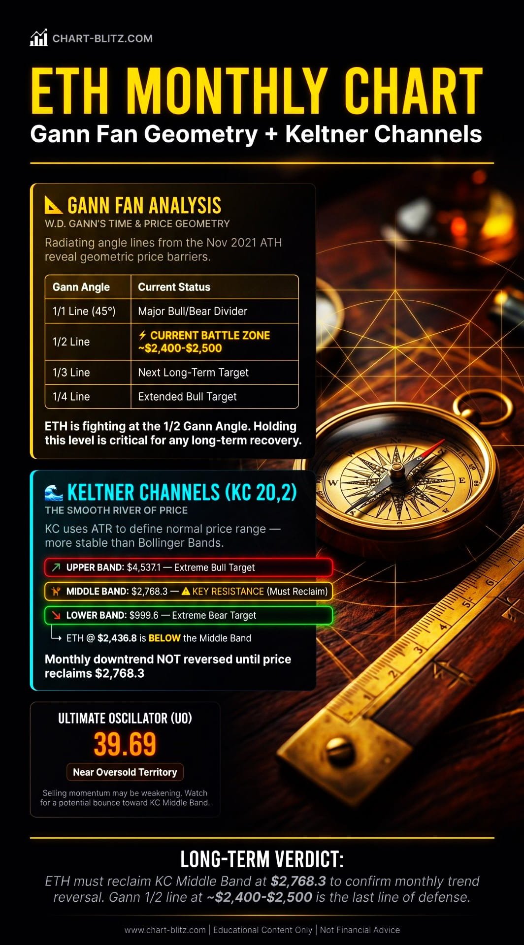 📅 Monthly Chart: The Time Geometry of Gann Fan and the Smooth River of Keltner Channels