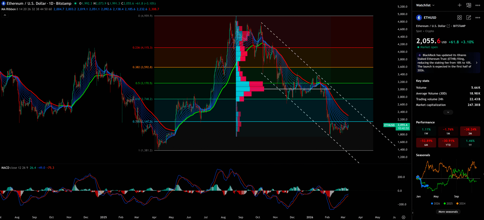 Currently, the ETH price is heavily suppressed below the 0.786 Fibonacci retracement level ($2,147). This is a formidable barrier. Simultaneously, a descending trendline (shown as a white dashed line on the chart) extending from the highs hangs over ETH like the Sword of Damocles, currently sitting around $2,200.