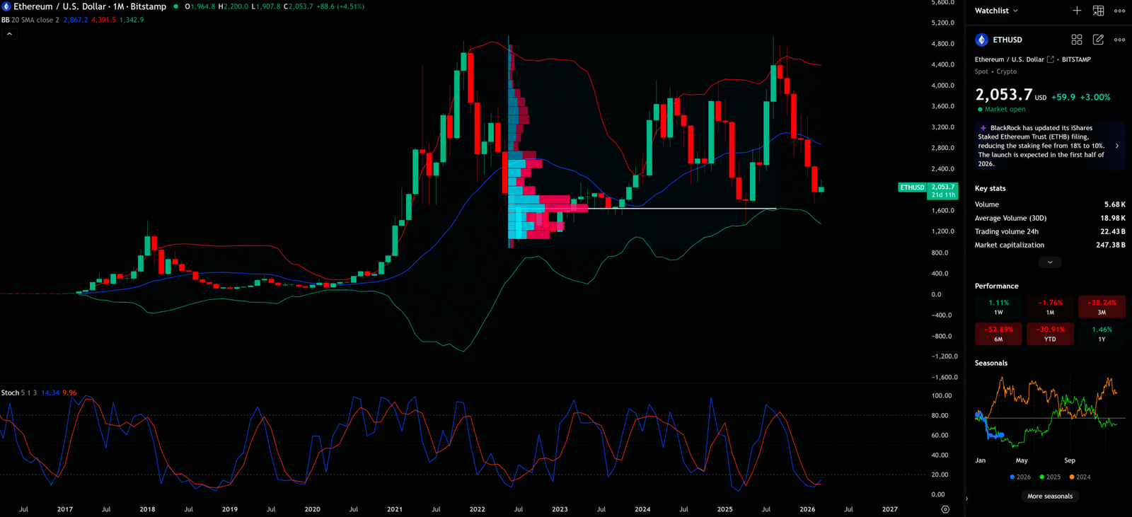 Looking at the Monthly Chart, the Bollinger Bands provide a macro boundary. ETH is currently struggling below the middle band ($2,867.2), approaching the lower band ($1,342.9). The Stochastic Oscillator (5,1,3) has plunged deep into oversold territory (K=14.34, D=9.96) and is showing faint signs of a bullish crossover. From a macro-cycle perspective, ETH’s downward momentum is exhausting, and an epic rebound is brewing.
