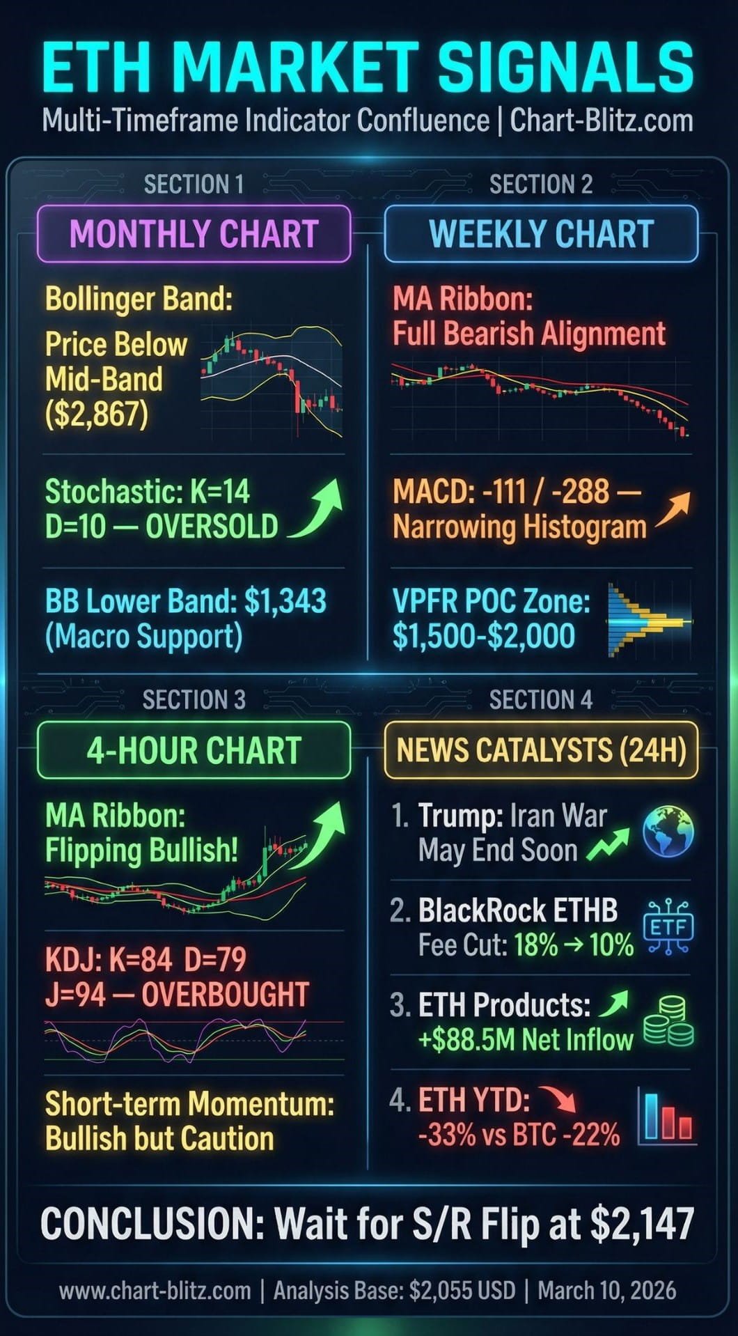 All technical analysis below is based on the locked price snapshot taken on March 10, 2026, 09:00 (GMT+8): ETH = $2,055 USD (cross-referenced from CoinGecko $2,046 and Yahoo Finance $2,066, averaged). Please treat this report as an “analytical map” rather than a real-time quote. Markets move fast; always use the actual market price at the time of your decision.