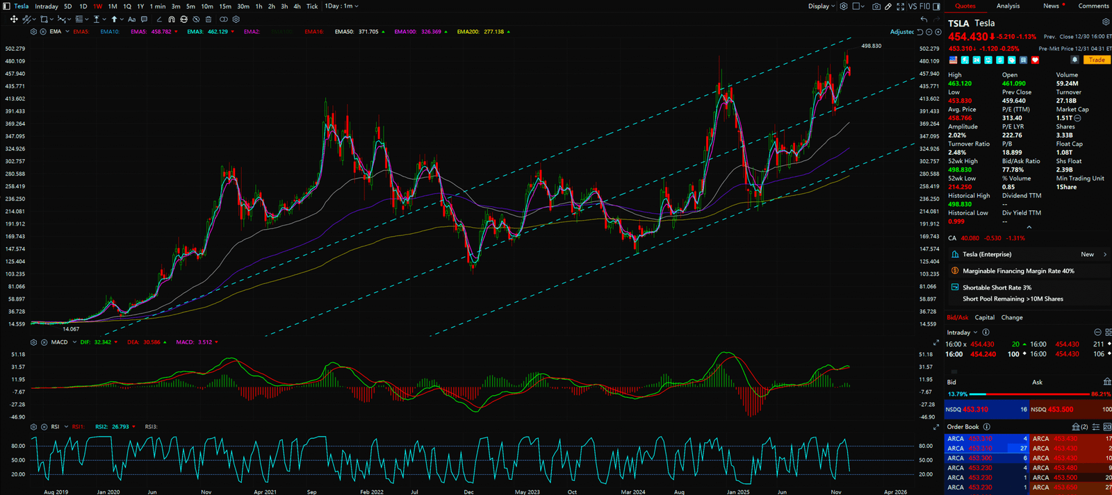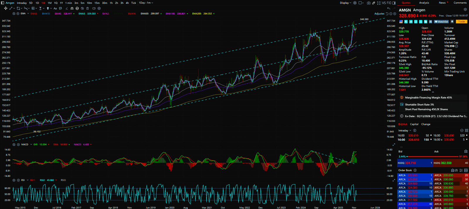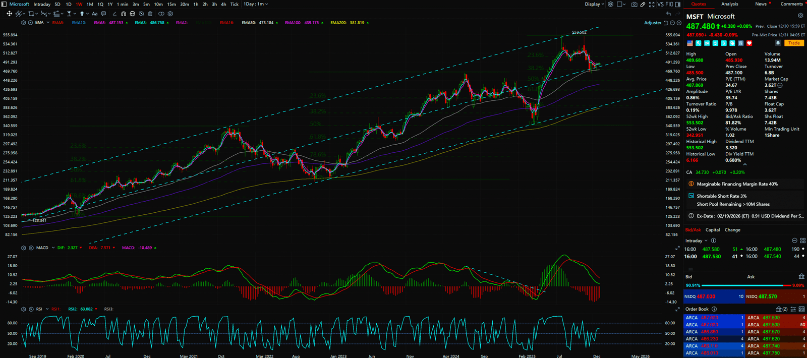 - MSFT is moving in an extremely standard, moderate ascending channel. The moving averages (EMA 20/50/200) are perfectly aligned. This is textbook Institutional Accumulation. The big boys are suppressing the price with algos to fill their bags without spiking the volatility.