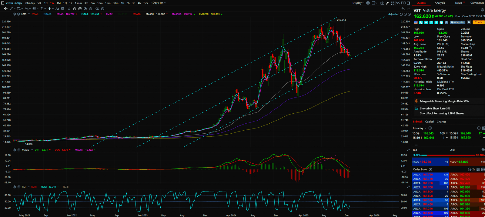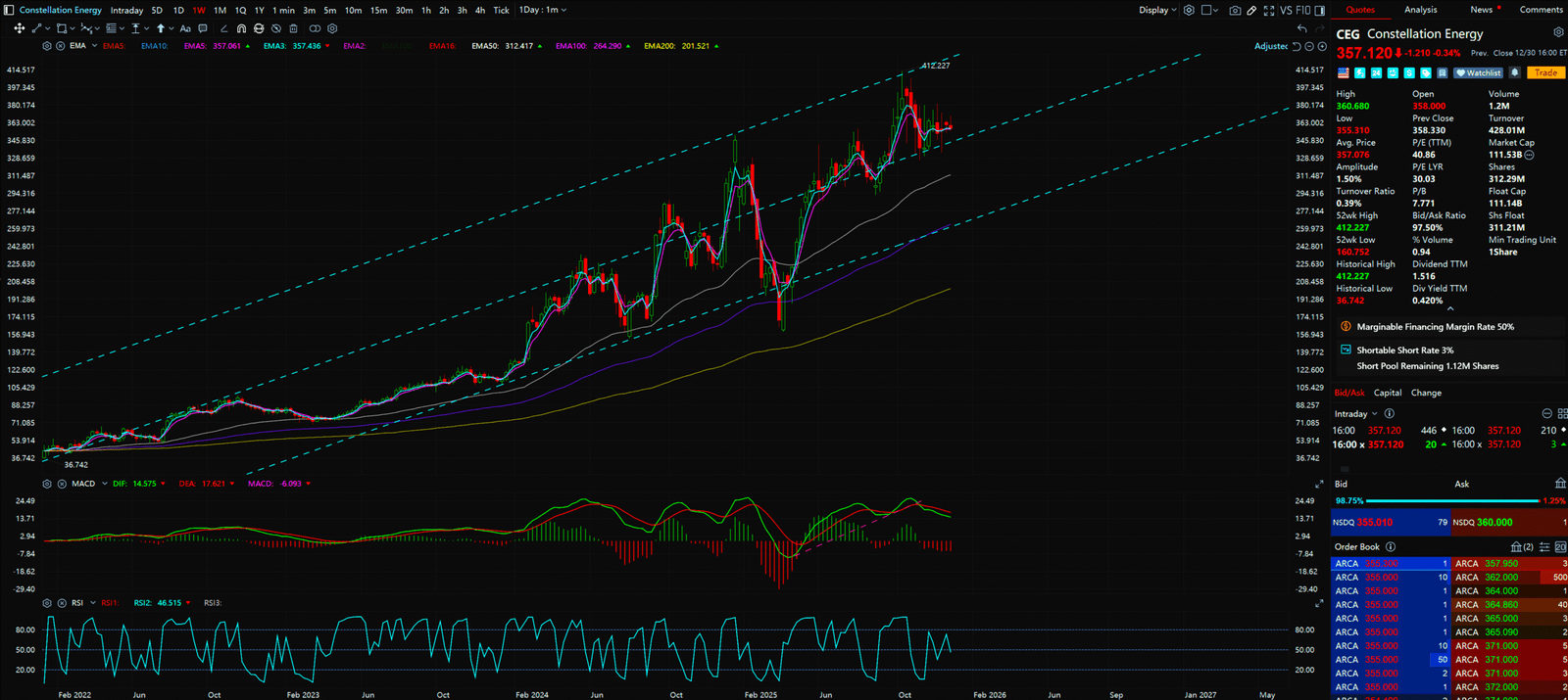 - Not as steep as CEG, but incredibly stable. Moving averages are fanning out (Bullish alignment).