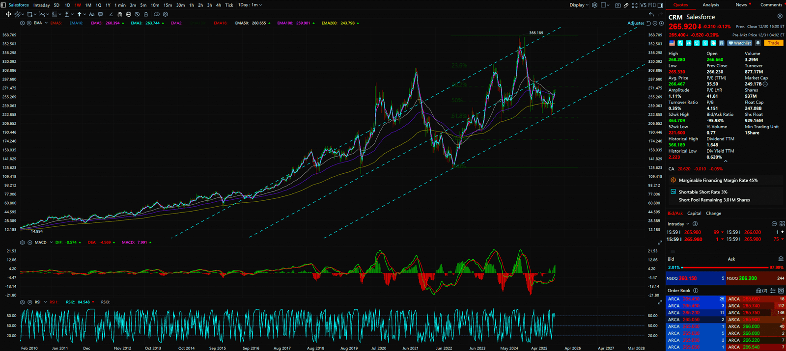 - CRM completed a massive multi-month Cup and Handle and has broken the neckline. It is currently in the Backtest Phase. This is one of the safest entries in technical analysis—Resistance turned Support.
