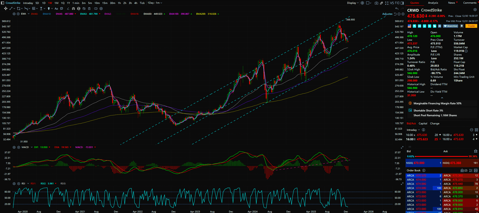 - Action: Buy Zone is at the channel midline or near the EMA 50 (460−470). Stop loss below $440. This is a “sleep well at night” hold.