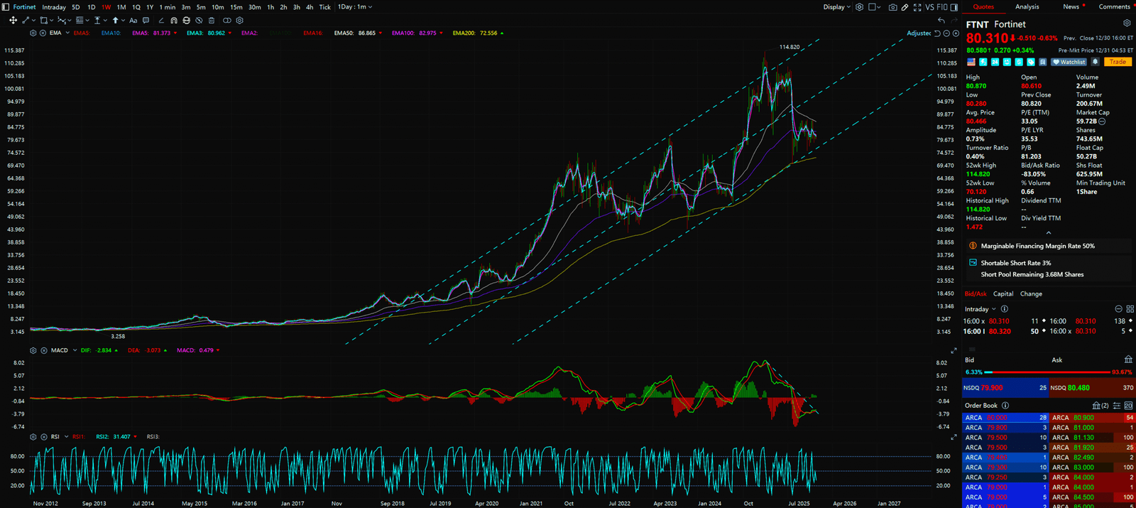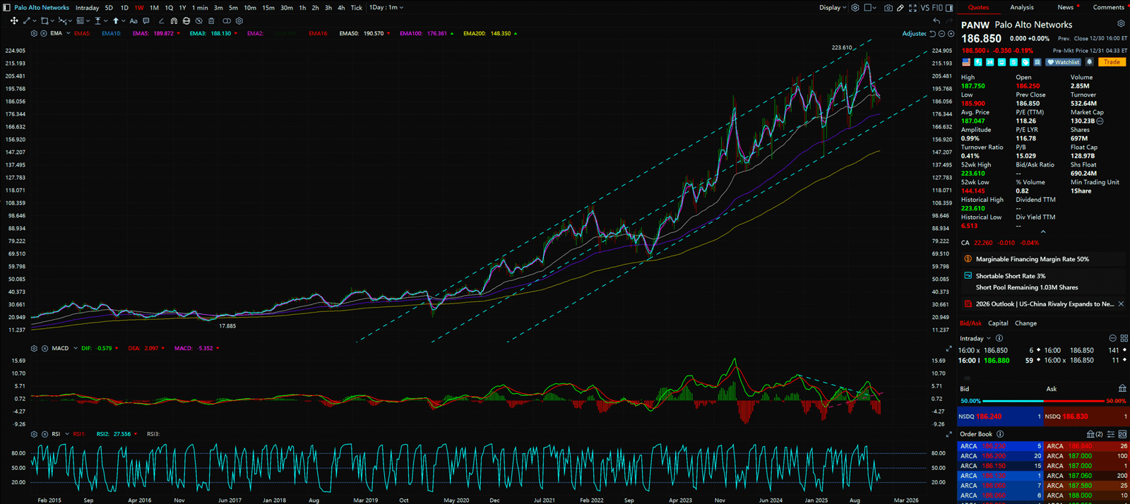 - More moderate volatility than PANW. Trades cleanly inside a channel.