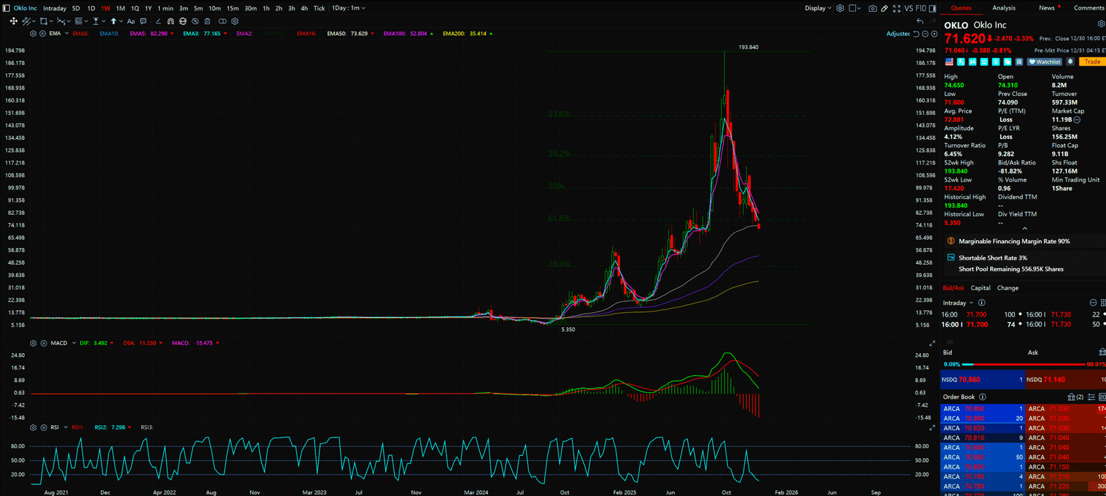 - OKLO is a SPAC. It had the classic “Pump and Dump.” Now, Volume is Drying Up at the lows, forming a W-Bottom. Risk: High Beta Speculation.