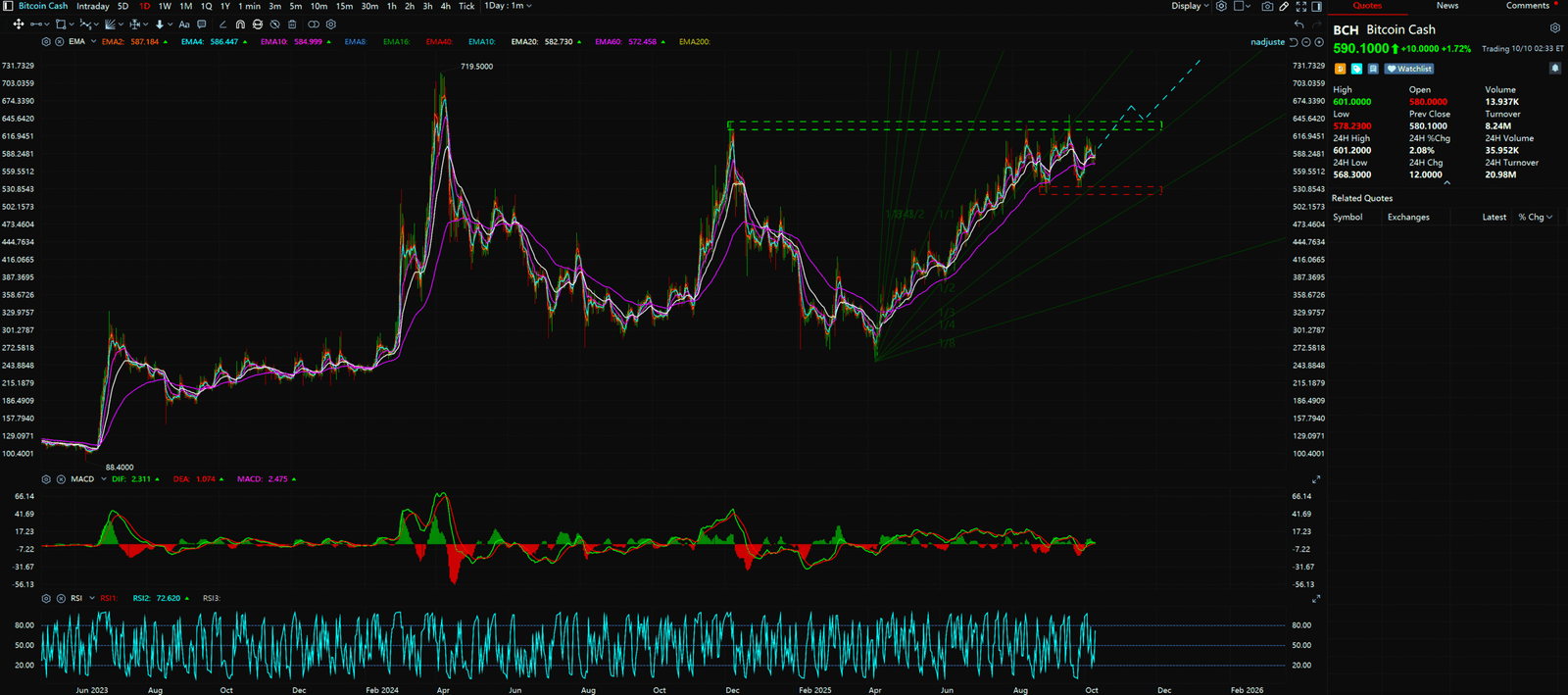 Analysis Benchmark Statement All subsequent technical analysis is based on a price snapshot locked in on October 10, 2025, 15:15 (UTC+8): BCH = $594.57 USD. This price snapshot provides a stable reference point for the analysis. All support, resistance, and projected paths are relative to this benchmark. As market prices are in constant flux, readers should treat this report as an “analytical map,” not as a real-time price feed.