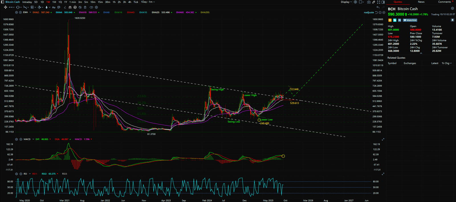 The conclusion is clear: BCH has broken free from its long-term bearish shackles. The current consolidation is a preparation for the next leg up. The true test lies in whether the price can decisively break the previous swing high of $719.5. A break above this level would confirm a new bull market structure of “Higher Highs and Higher Lows,” at which point a more powerful and sustained uptrend can be reasonably expected. Conversely, if the price fails to break out and instead breaks down below the key daily support at $524 and the weekly pink support line at $529.613, it would signify a failed breakout. The bullish thesis would be invalidated, and strict risk management must be enforced.