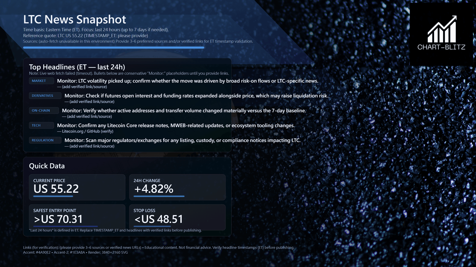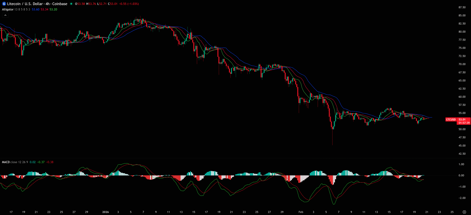 All technical analysis below is based on the price snapshot locked on 2026-02-21, 00:55 (ET): LTC (Litecoin) = 53.78 USD. This snapshot provides a stable reference point. All support, resistance, and projected paths are relative to this benchmark. Market prices change instantly; please treat this report as an “analytical map,” not a real-time quote.