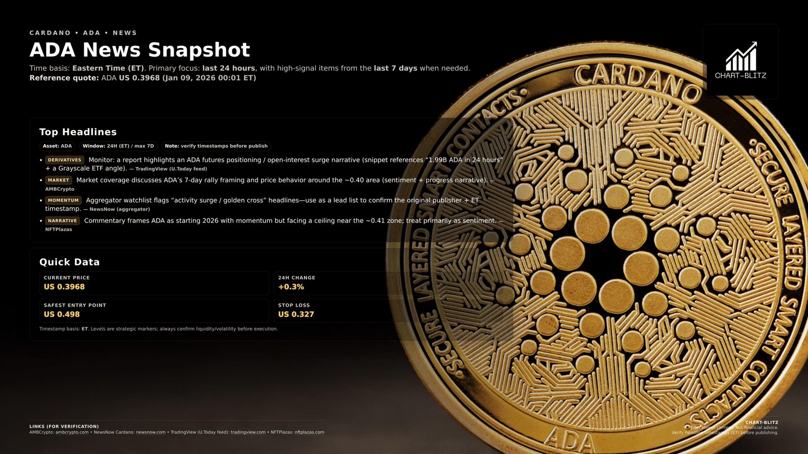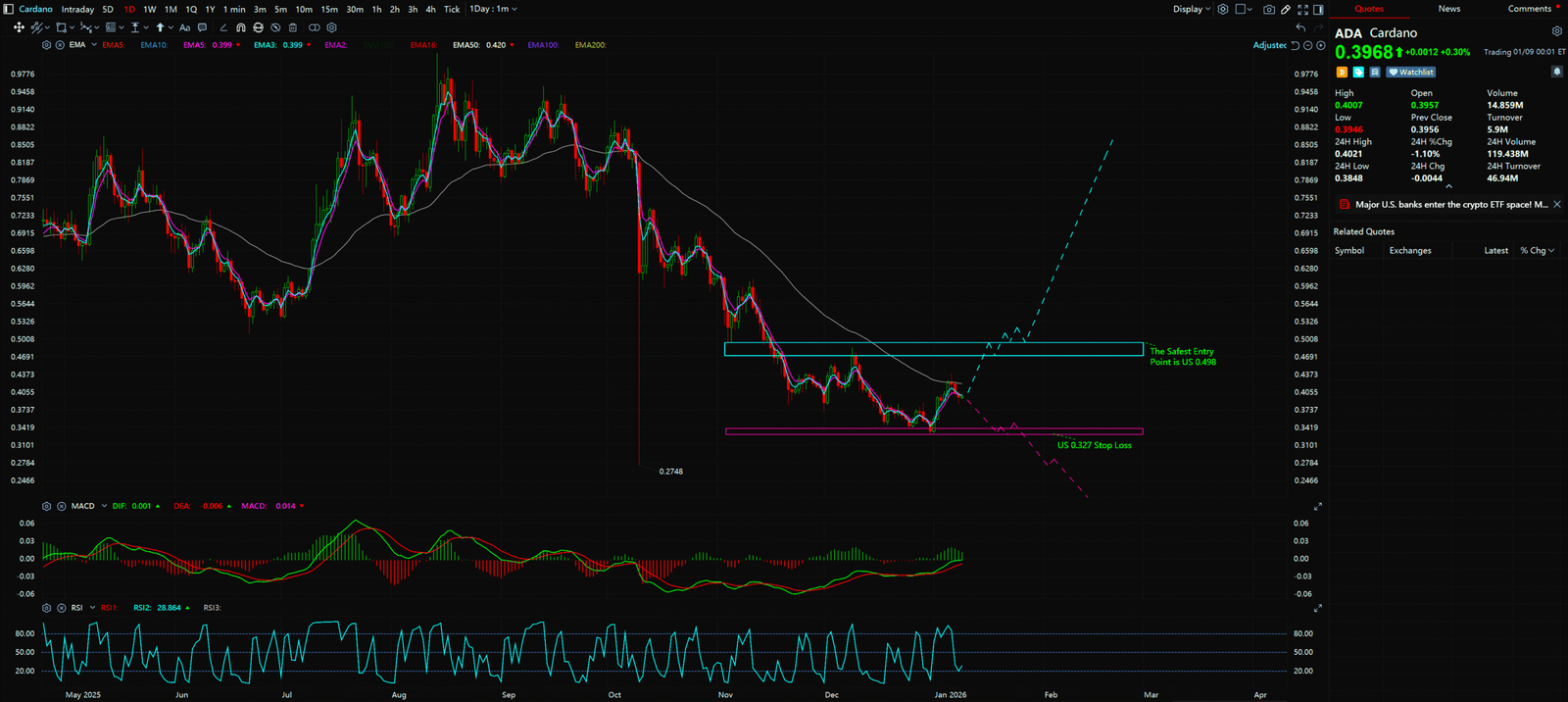 All technical analysis below is based on the price snapshot locked on Jan 9, 2026, 15:56 (EST): ADA = 0.3980 USD. This snapshot provides a stable reference point. All support, resistance, and projected paths are relative to this baseline. Market prices are volatile; please view this report as an “analytical map,” not a real-time quote.