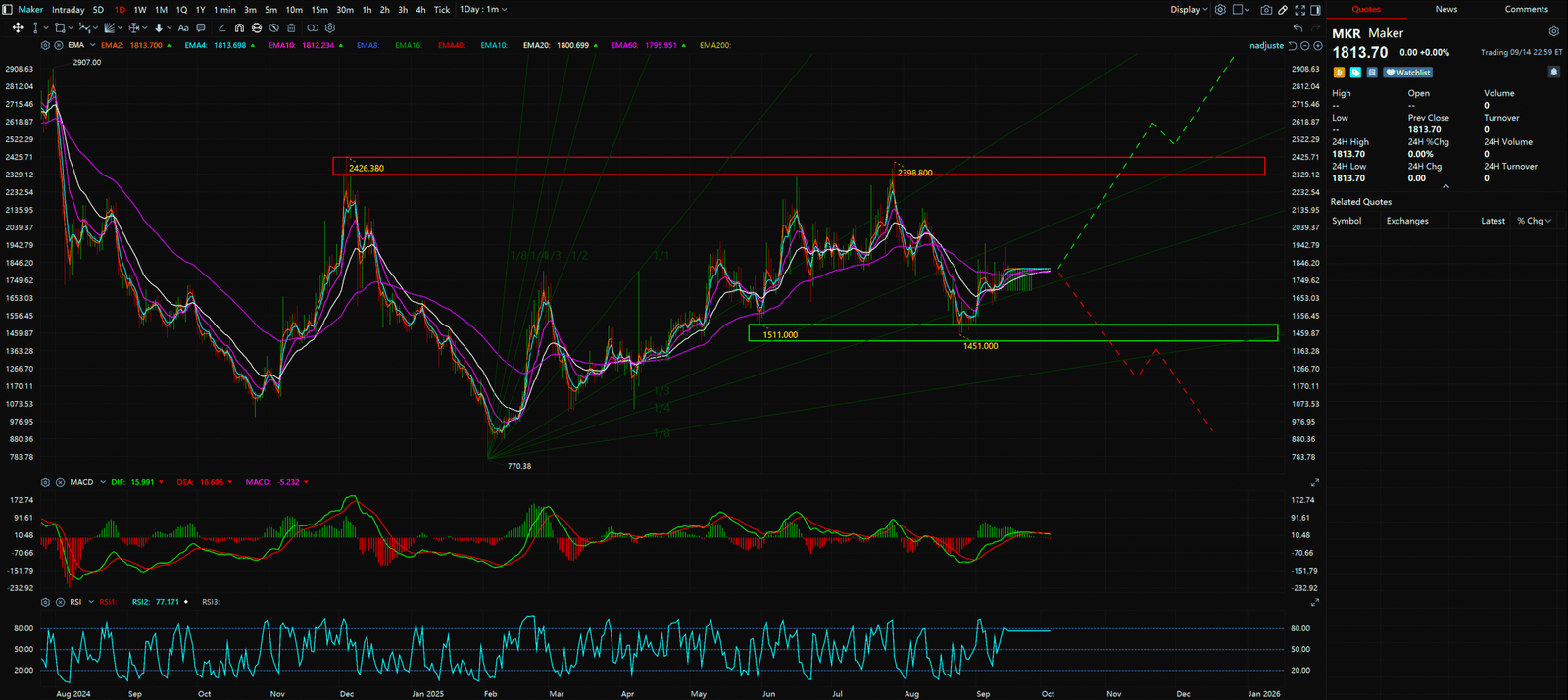 Analysis Benchmark Statement All subsequent technical analysis is based on a price snapshot locked in on October 8, 2025, 14:33 (UTC+8): MKR = $1,813.70 USD. This price snapshot provides a stable reference point for the analysis. All support, resistance, and projected paths are relative to this benchmark. As market prices are highly volatile, readers should treat this report as an “analytical map,” not a real-time price feed.