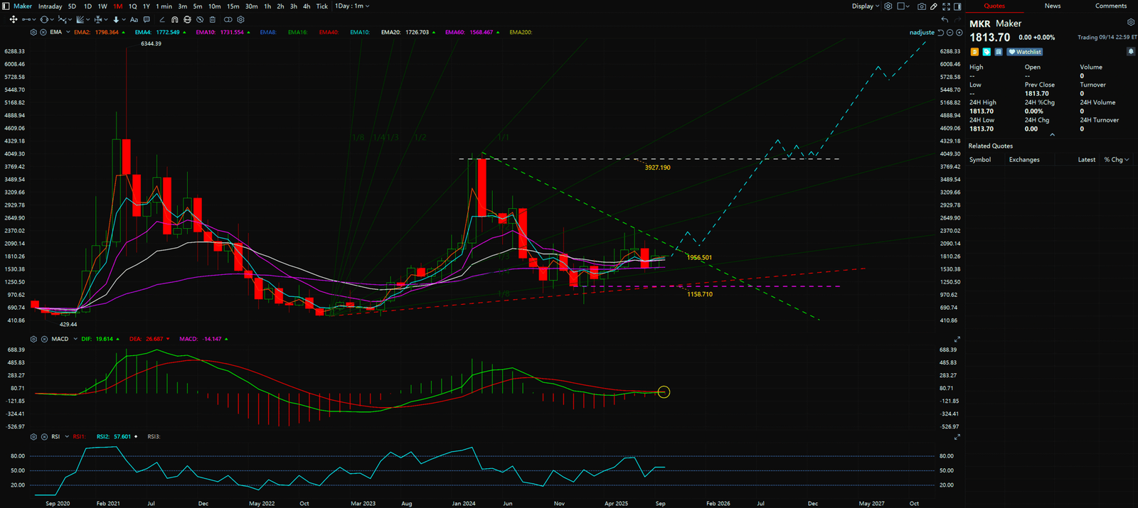 Synthesizing the monthly and daily charts leads to a clear conclusion: MKR is at a critical juncture of “long-term bullish, mid-term bottoming.” The Horizontal triangle on the monthly chart offers immense potential for long-term appreciation, while the double-bottom support ($1511) and stabilizing structure on the daily chart provide a solid foundation for this long-term scenario. The fundamental “noise” about rising exchange balances, when juxtaposed with the powerful technical structure, is more likely a smokescreen for accumulation or a tactic to induce panic. As long as the price respects the key support level on the daily timeframe, a breakout to the upside is the higher probability event.
