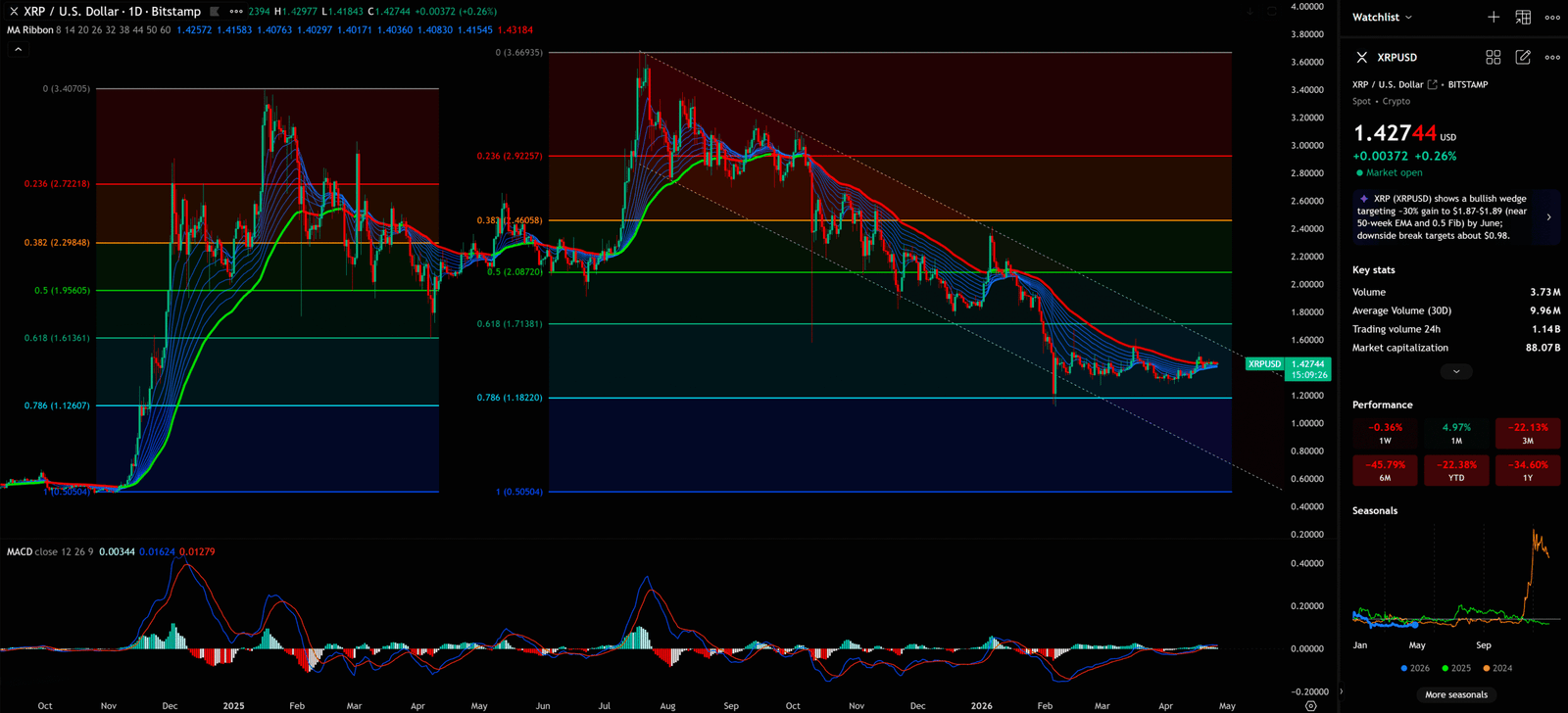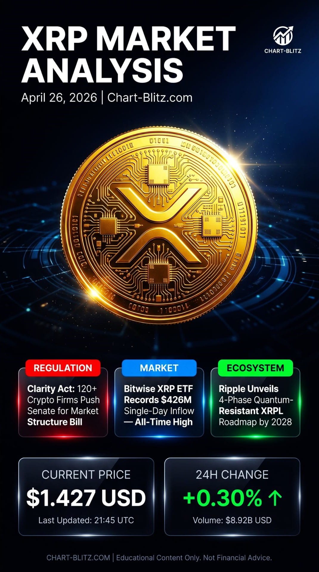 All technical analysis below is based on the price snapshot locked at 2026-04-26 15:00 EST: XRP = 1.427 USD. Please treat this report as an ‘analysis map’ rather than real-time quotes. Data cross-referenced from CoinMarketCap ($1.43 USD) and CoinGecko ($1.427 USD); market average of $1.427 USD used as the sole analysis benchmark.