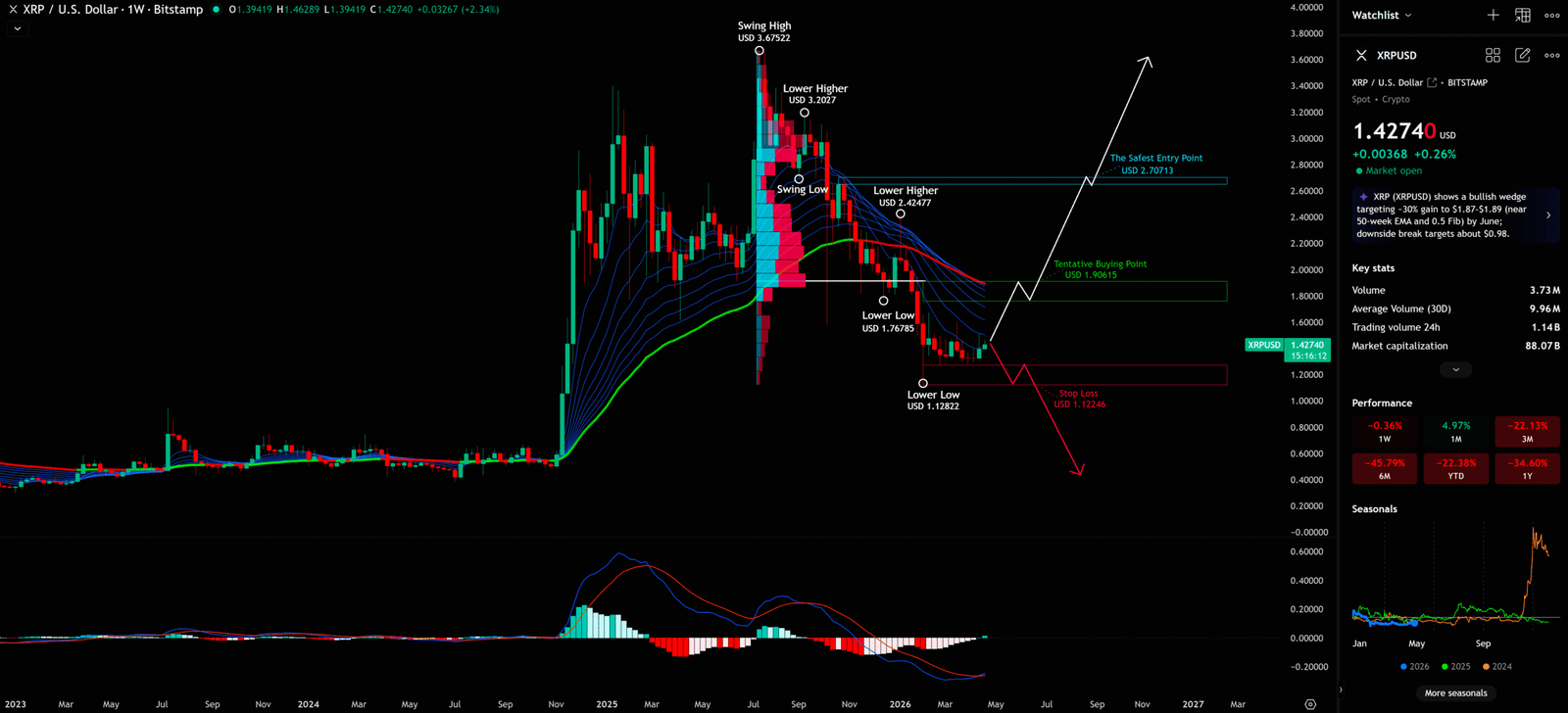 Currently, XRP’s price (1.427 USD) is sandwiched between the ‘Tentative Buying Point (USD 1.90615)’ and the ‘Stop Loss (USD 1.12246)’. This is an extremely dangerous position — still a considerable distance from a safe buying point, yet dangerously close to the stop loss.