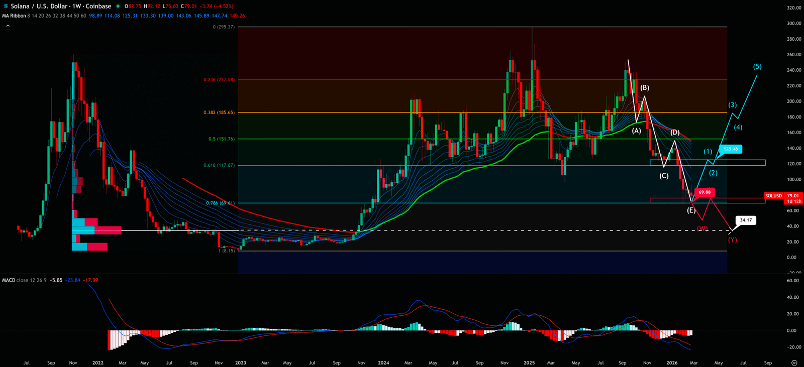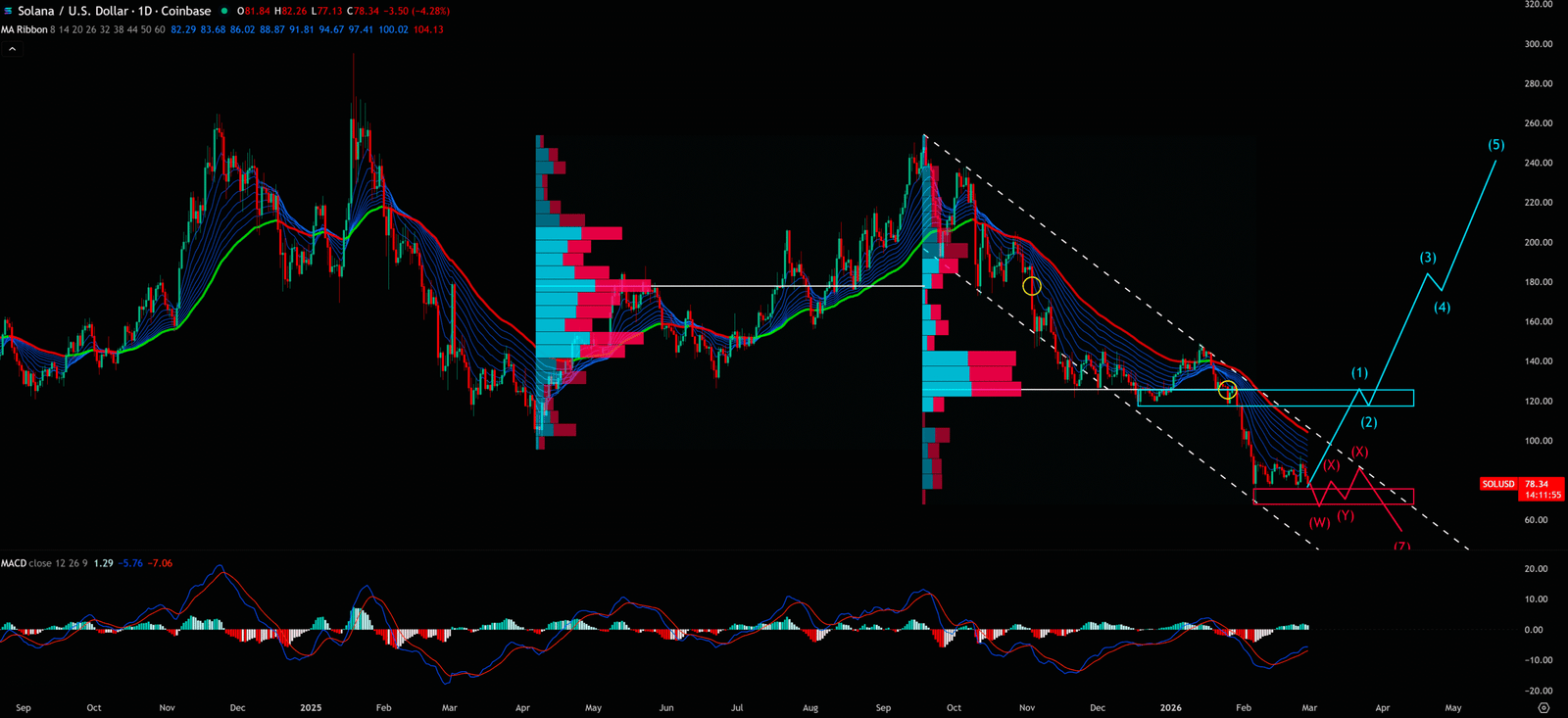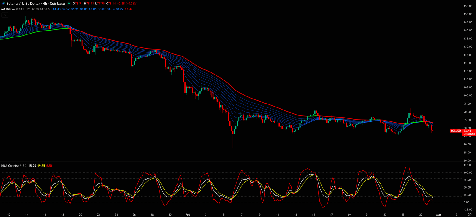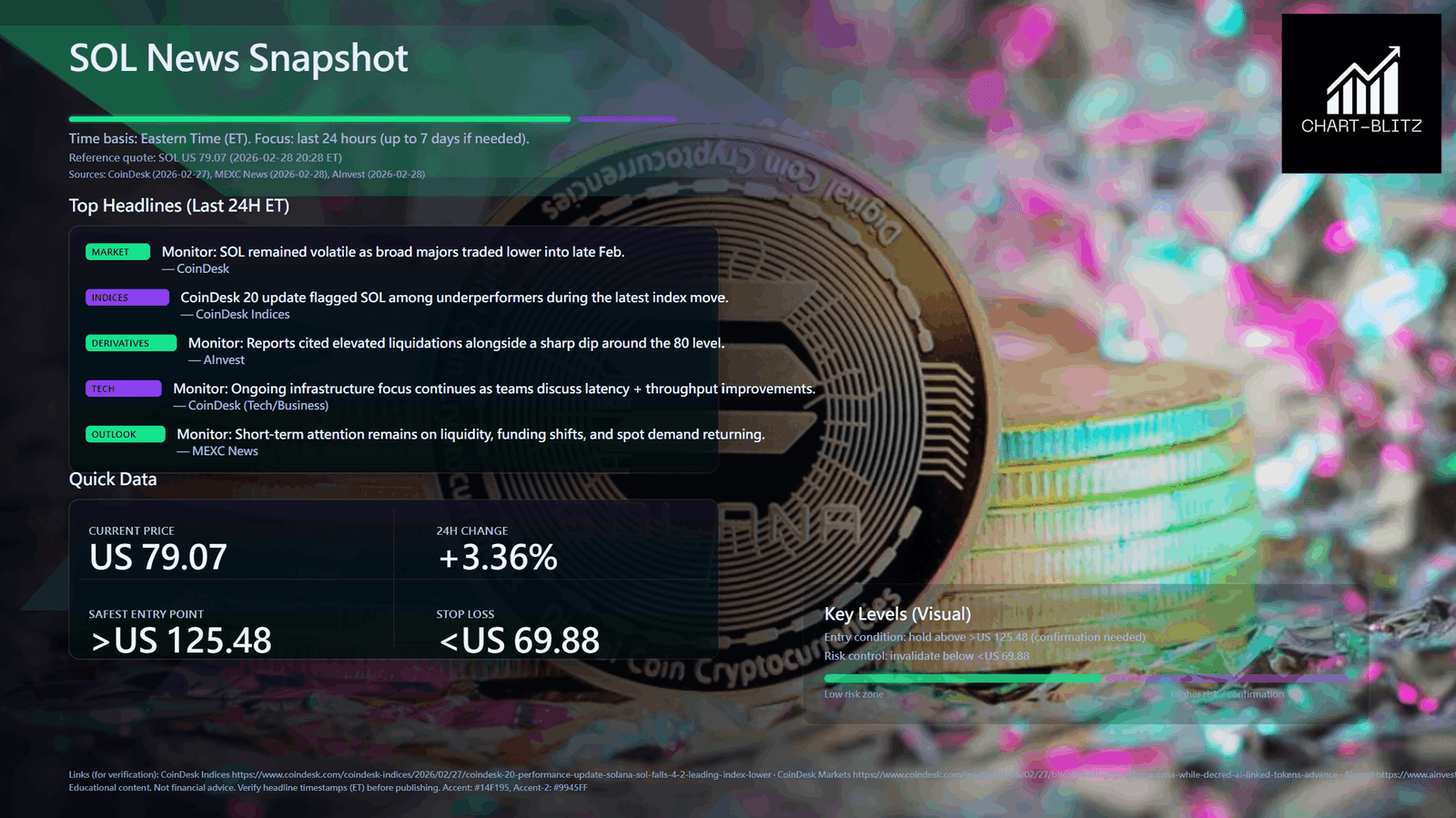 All technical analysis below is based on the price snapshot locked on February 28, 2026: SOL = USD 79.01. This snapshot provides a stable reference point. All support, resistance, and projected paths are relative to this baseline. Market prices change instantly; please view this report as an ‘analytical map,’ not a real-time quote.
