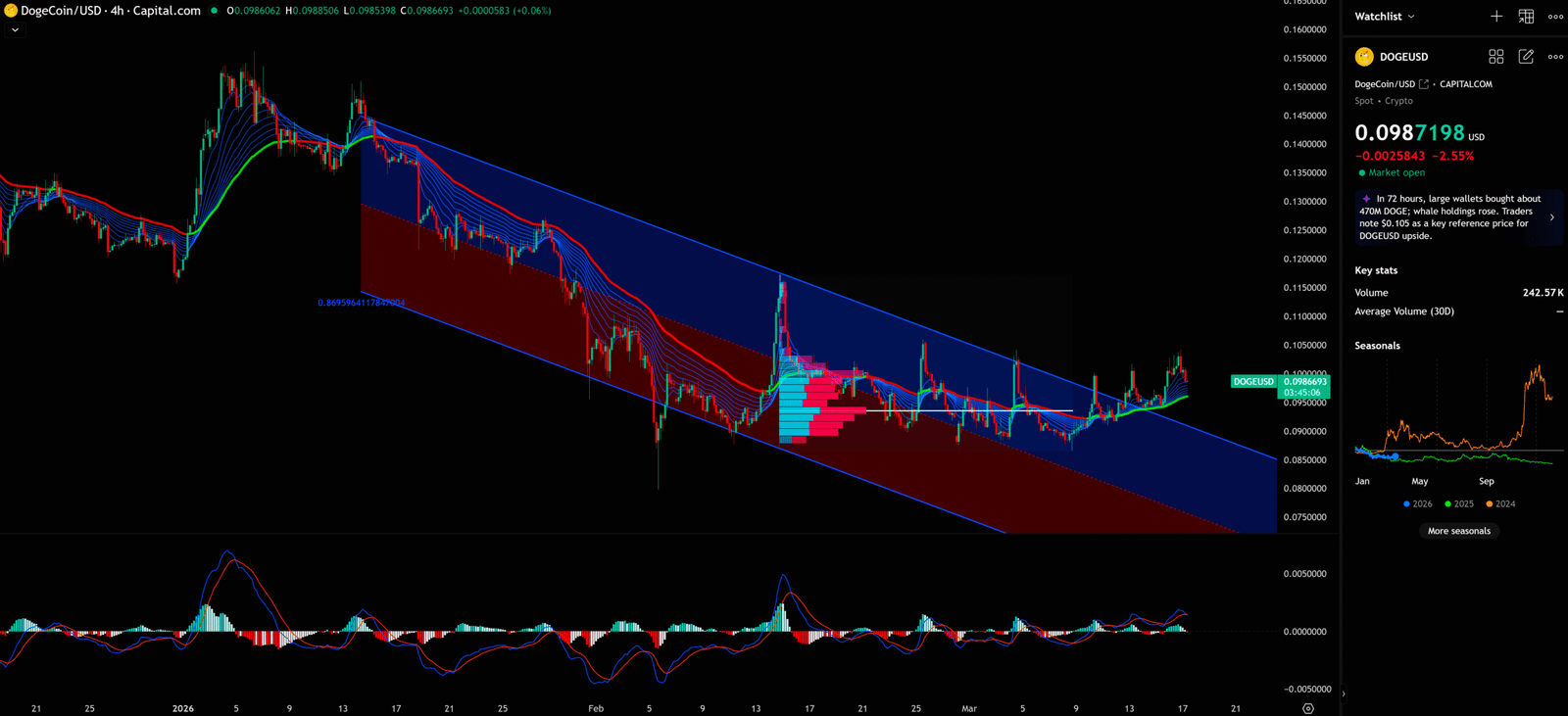 All technical analysis below is based on the price snapshot locked at 17:26 ET on March 17, 2026: DOGE = $0.0988 USD. Please treat this report as an ‘analysis map’ rather than a real-time quote.
