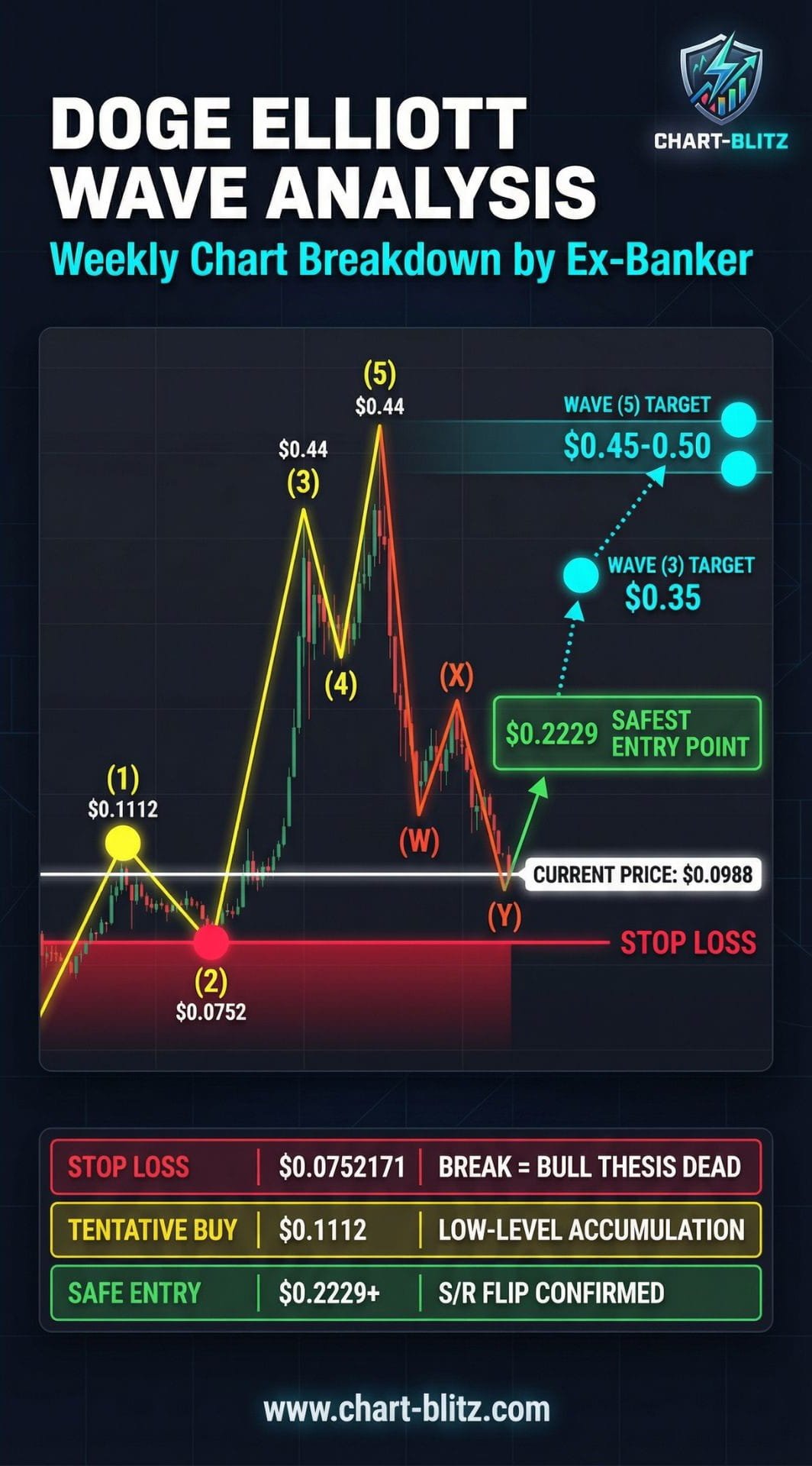 The weekly chart is always the absolute core of our analysis. Looking at the DOGE weekly chart, since peaking and retreating in late 2024, it is currently at the end of a complex W-X-Y corrective structure. If we apply the impulse wave hypothesis of Elliott Wave Theory, the current DOGE price ($0.0988) is hovering exactly near the extremely critical bottom of Wave (2).