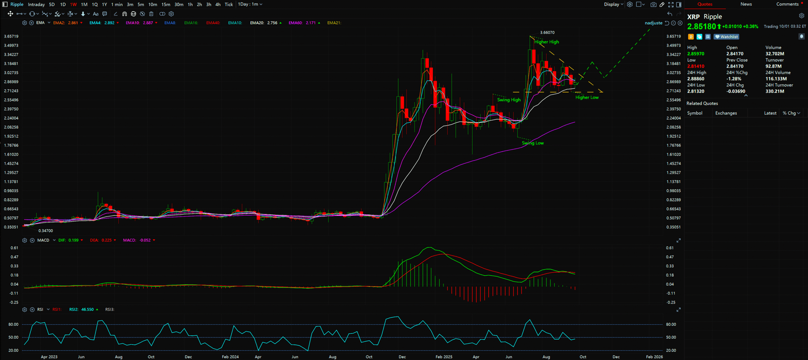 Analysis Benchmark Statement: All subsequent technical analysis is based on a price snapshot locked on Oct 1, 2025, 16:08 (UTC+8): XRP = 2.825 USD. This price snapshot provides a stable reference for the analysis. All support, resistance, and projected paths are relative to this benchmark. As market prices are volatile, readers should treat this report as an “analytical map,” not a real-time quote.b.
