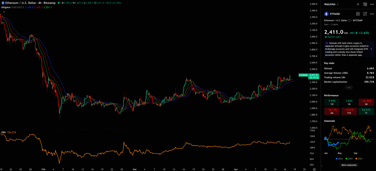 ⏱️ 4小時圖 (4-Hour Chart):Alligator 甦醒與 OBV 資金流向確認