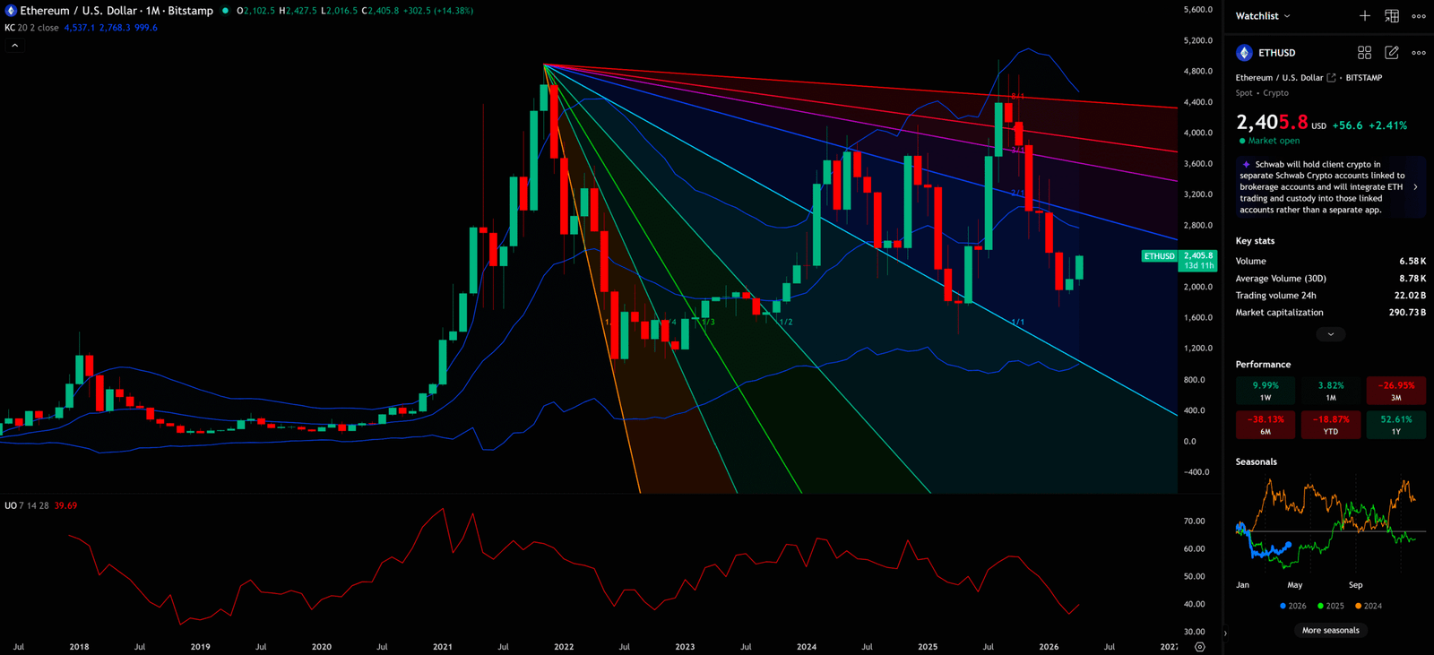 基本面新聞提供「分析對象」,但只有嚴謹嘅技術分析先可以預測未來市場走勢嘅「時機」同「方式」。今日,我哋就拋開嗰啲喧鬧嘅新聞,直接用技術圖表呢塊「照妖鏡」,由大至細(週線 -> 日線 -> 月線 -> 4小時),為大家降維打擊,深度剖析 ETH 真正嘅走勢軌跡。