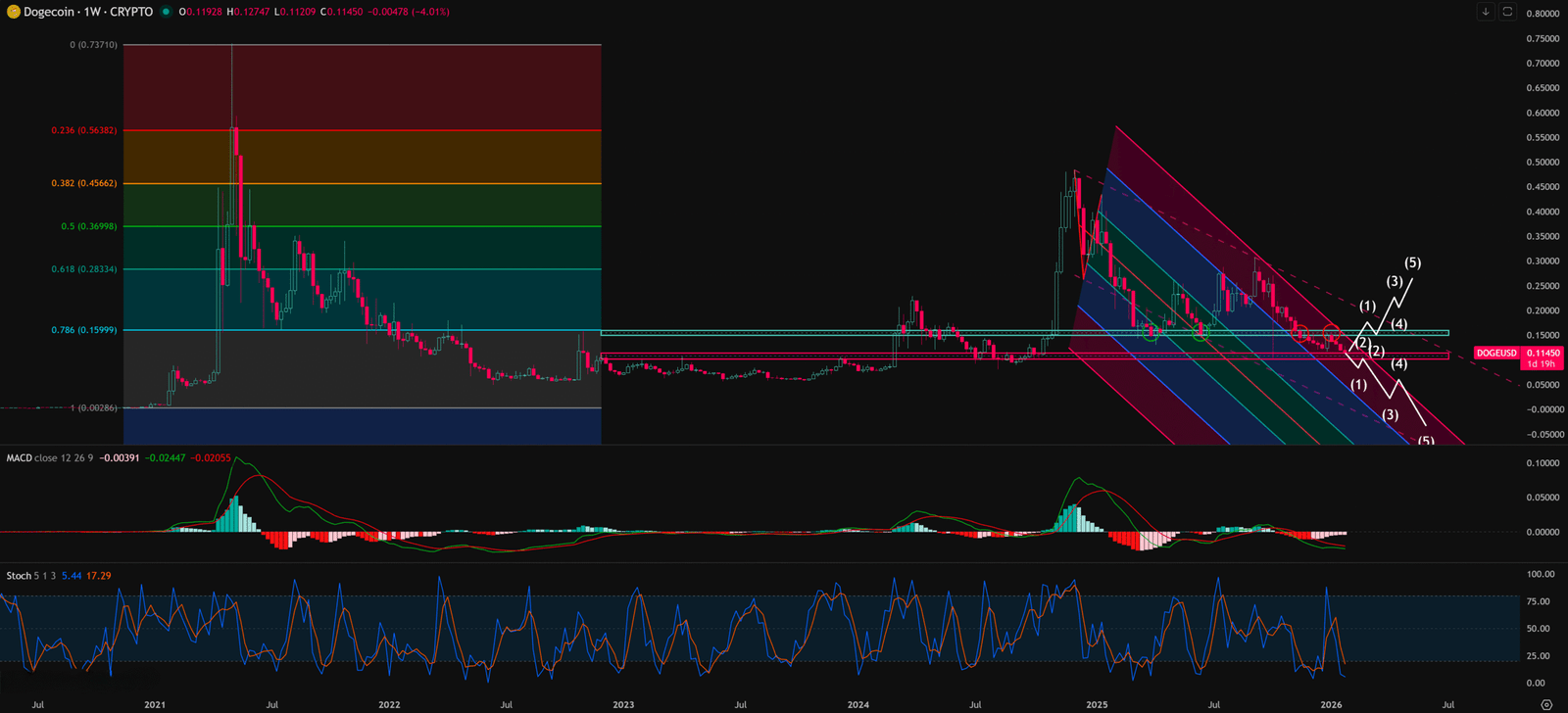 請仔細睇我提供嘅 DOGE 週線圖 (Weekly Chart):