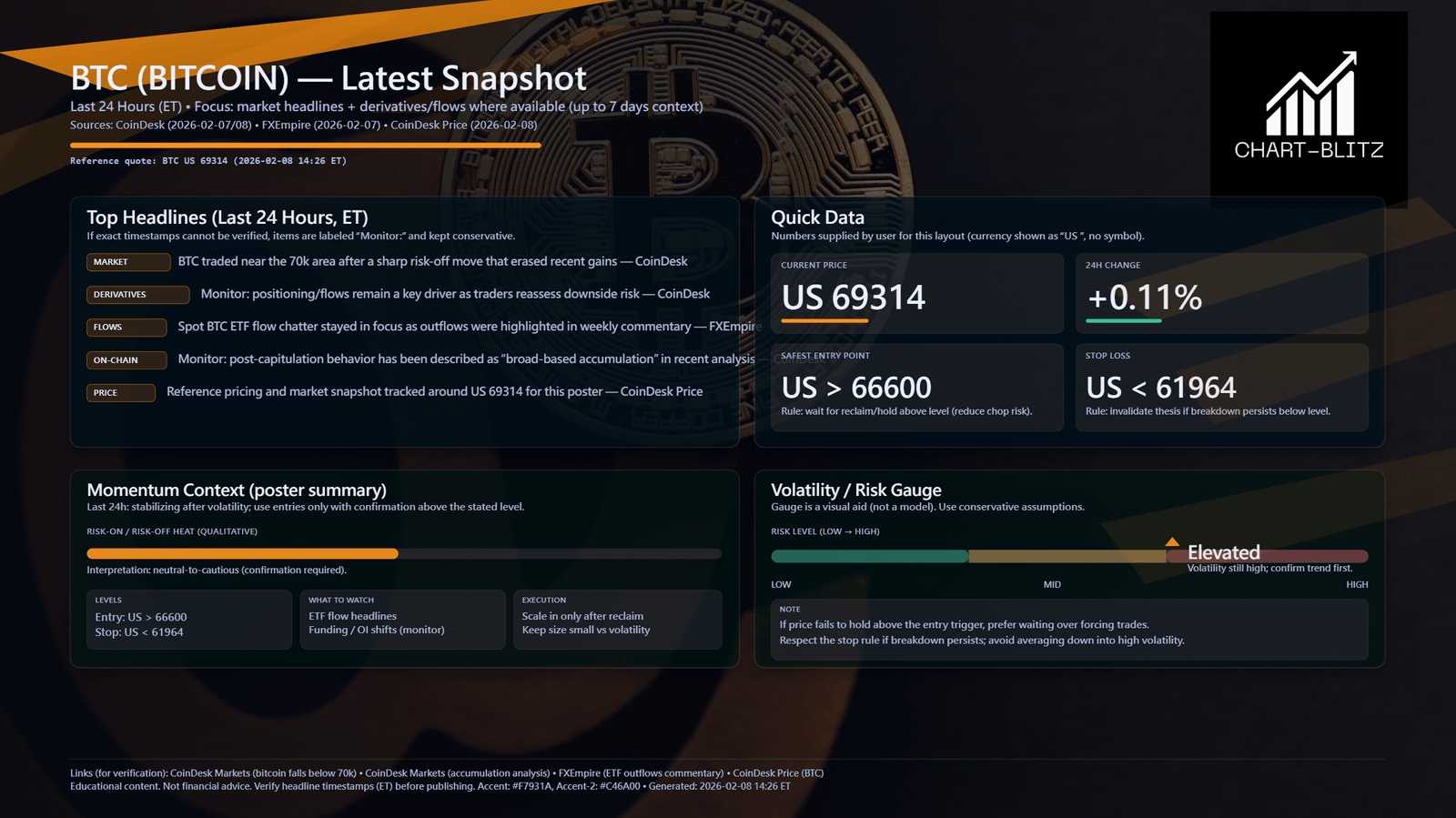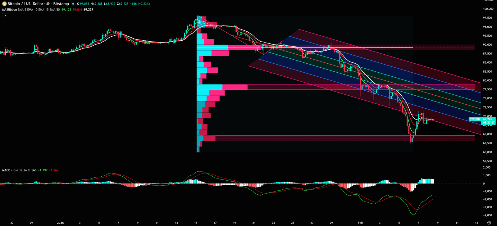 以下所有技術分析,均基於 2026年2月8日, 14:26 (ET) 所鎖定嘅價格快照:BTC = US 69,314。 此價格快照為分析提供穩定參考點。所有支持、阻力及預測路徑均相對於此基準。市場價格瞬息萬變,請讀者將此報告視為一張「分析地圖」,而非實時報價。當你閱讀本文時,價格可能已經變動,但背後嘅邏輯與關鍵位依然有效。