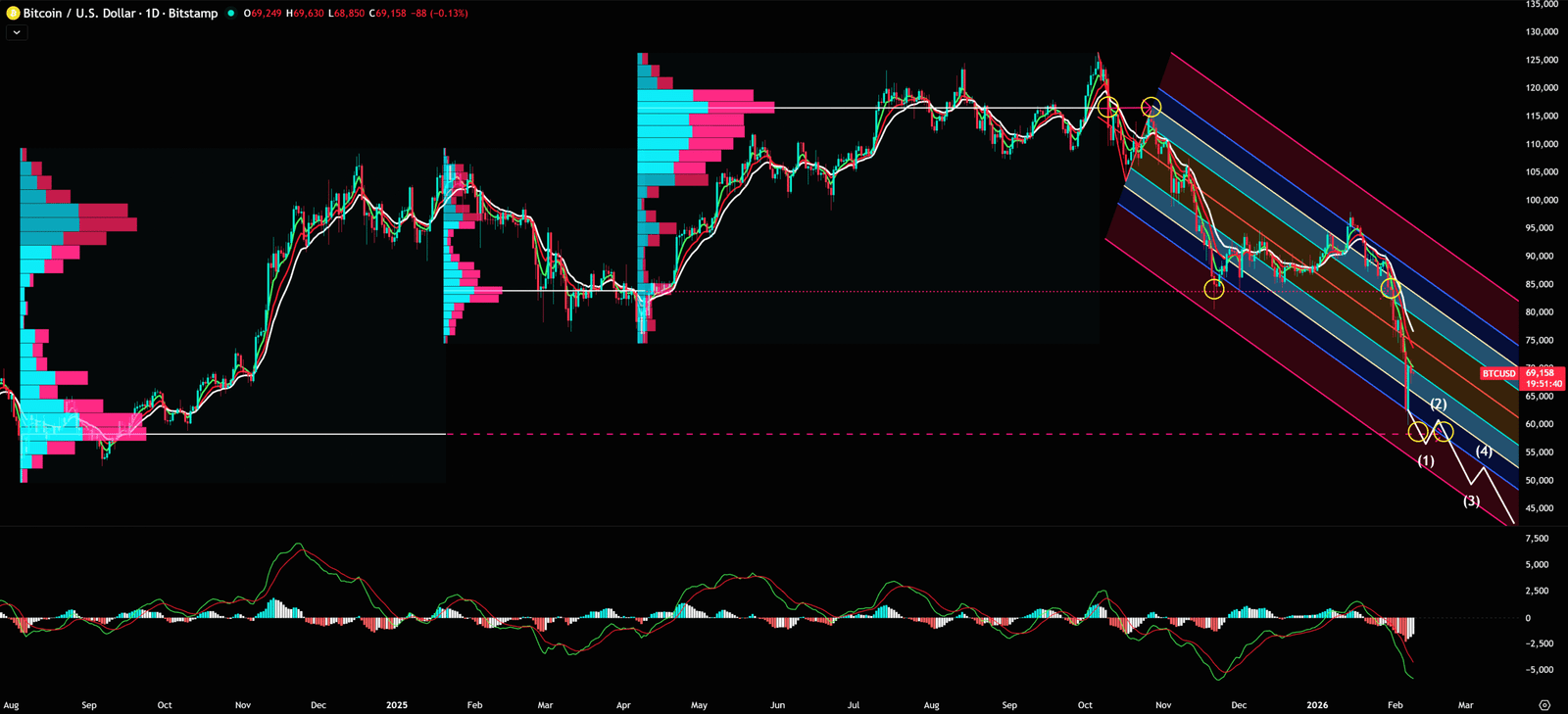 目前的圖表結構呈現「週線級別下跌」與「日線級別尋底」的共振。雖然 60k 附近有斐波那契支持,但在缺乏反轉形態確認前,進場風險極高。我們現在處於「防守」模式,而非「進攻」模式。與其依家賭博,不如耐心等待!