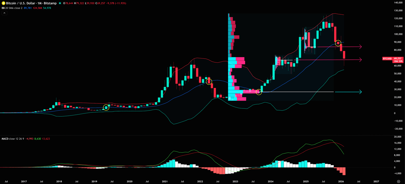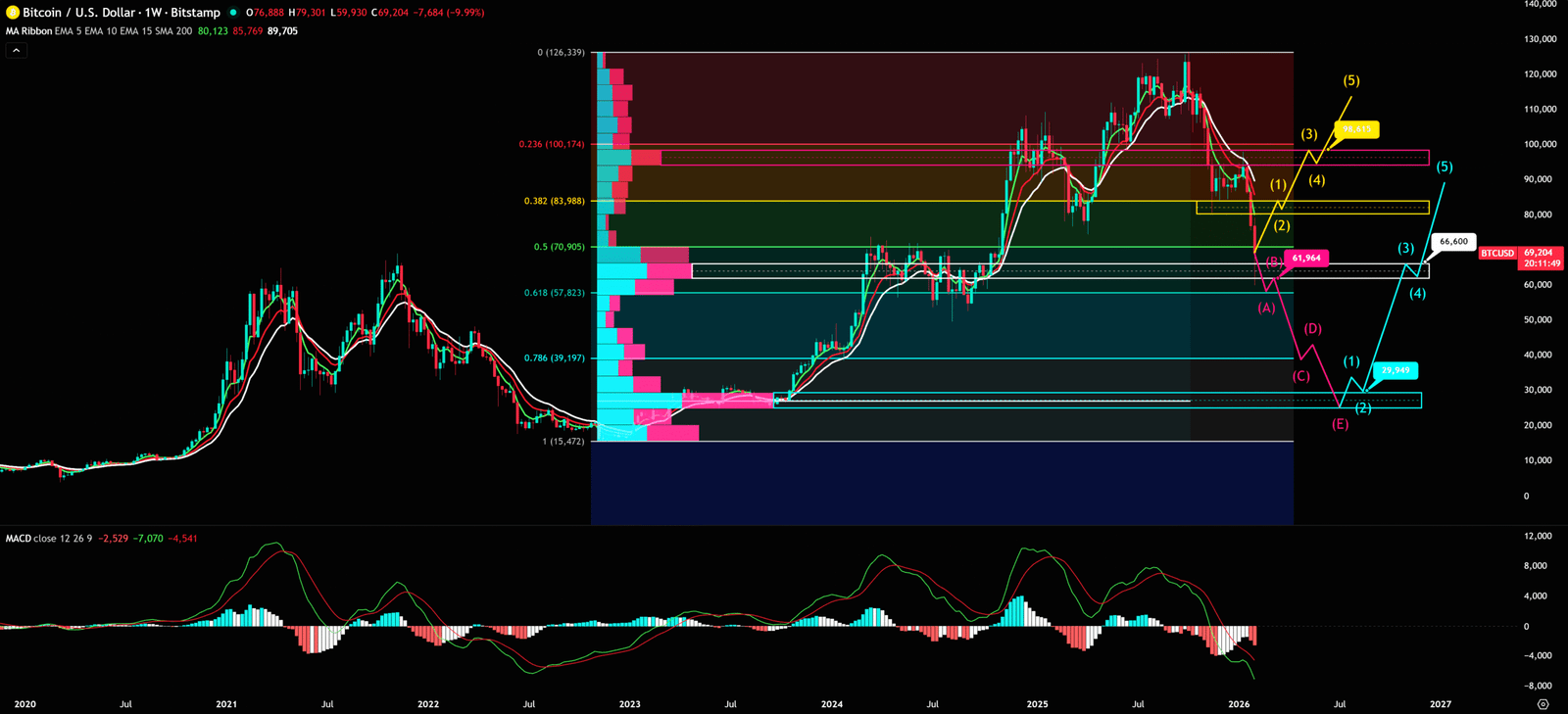 目前市場最大嘅焦點,亦係最大嘅陷阱,在於價格正逼近 US 60,000 心理關口。若以 2022 年 11 月底部 (US 13,600) 至 2025 年高位 (US 126,199) 嘅長期升浪計算,US 60,000 剛好處於 斐波那契回撤 (Fibonacci Retracement) 61.8% 嘅位置。