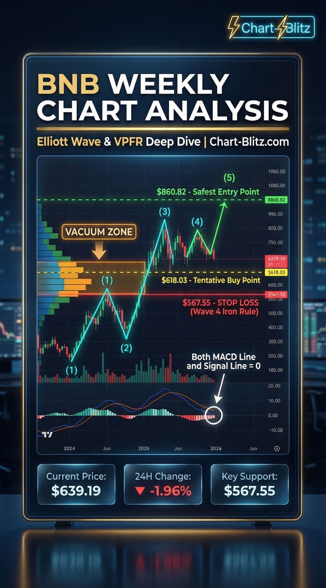 圖表上標示的關鍵防線是 $567.55。這個位置被標記為「Stop Loss」,也是第 1 浪頂部的關鍵區域。如果 BNB 的價格跌穿 $567.55 並無法收回,那麼整個 1-2-3-4-5 向上推動浪的假設將徹底破滅。這意味著當前的下跌可能只是更大級別調整浪 (A-B-C) 的一部分,而非第 4 浪的調整。在這種情況下,目標可能指向更低的水平。
