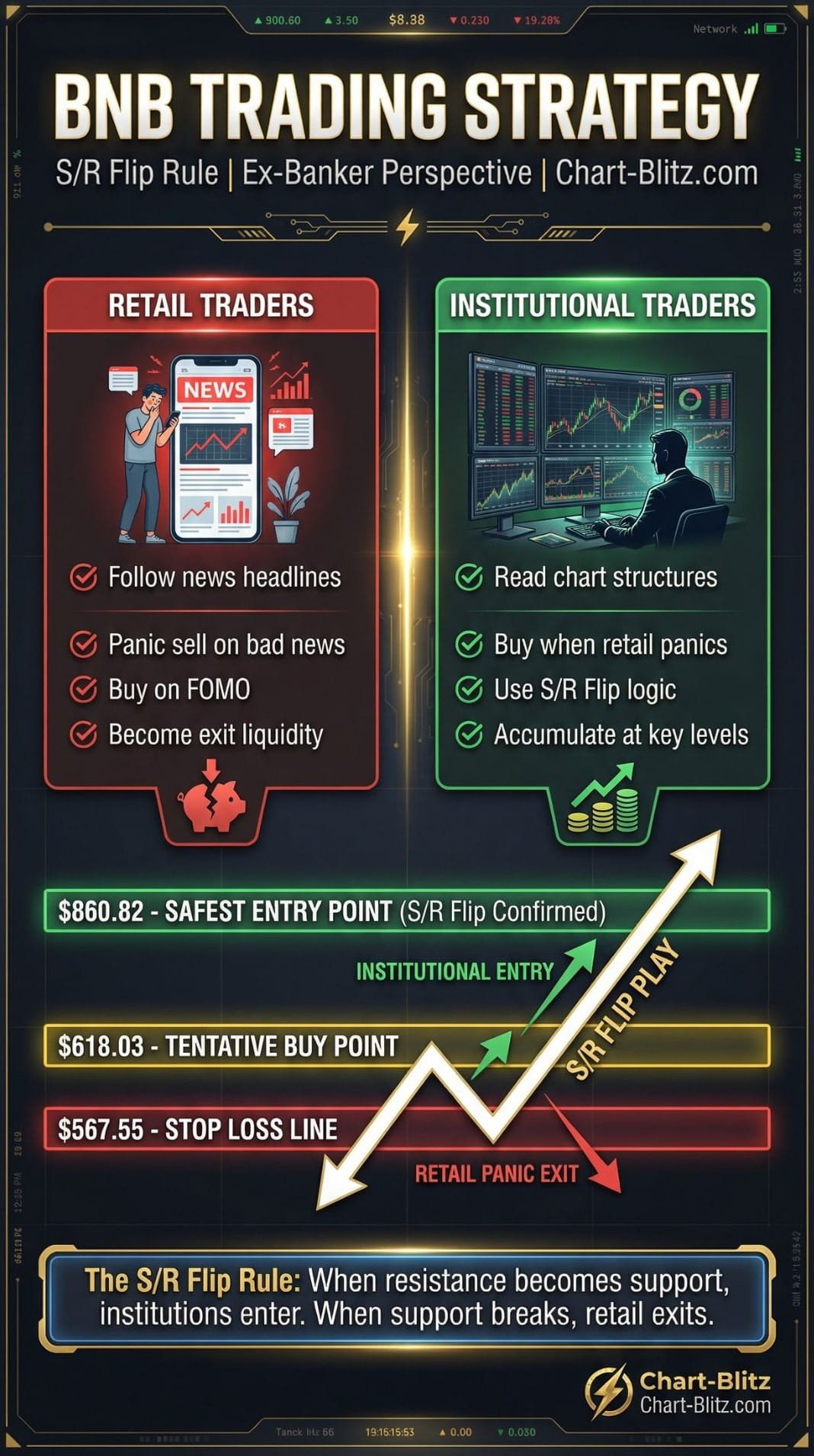 在推演 BNB 未來價格走勢及制定交易計劃時,我們必須運用 S/R Flip 法則: