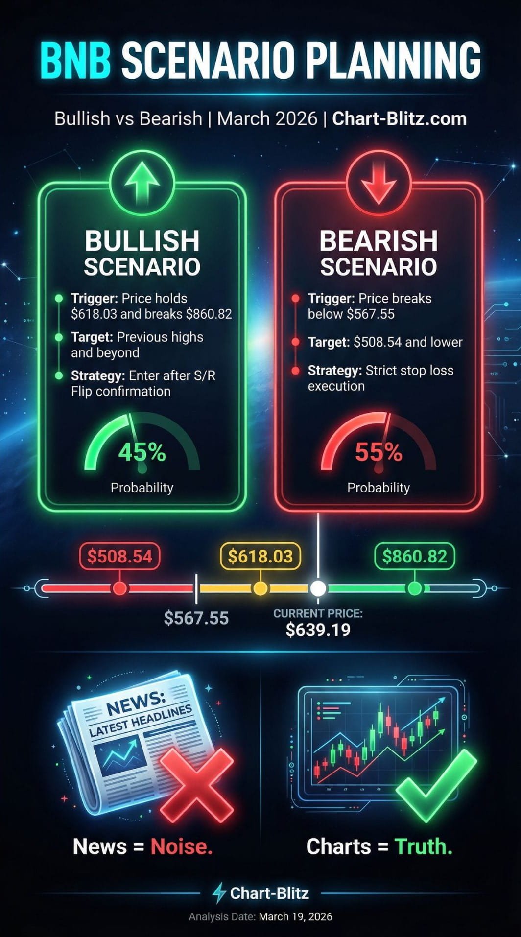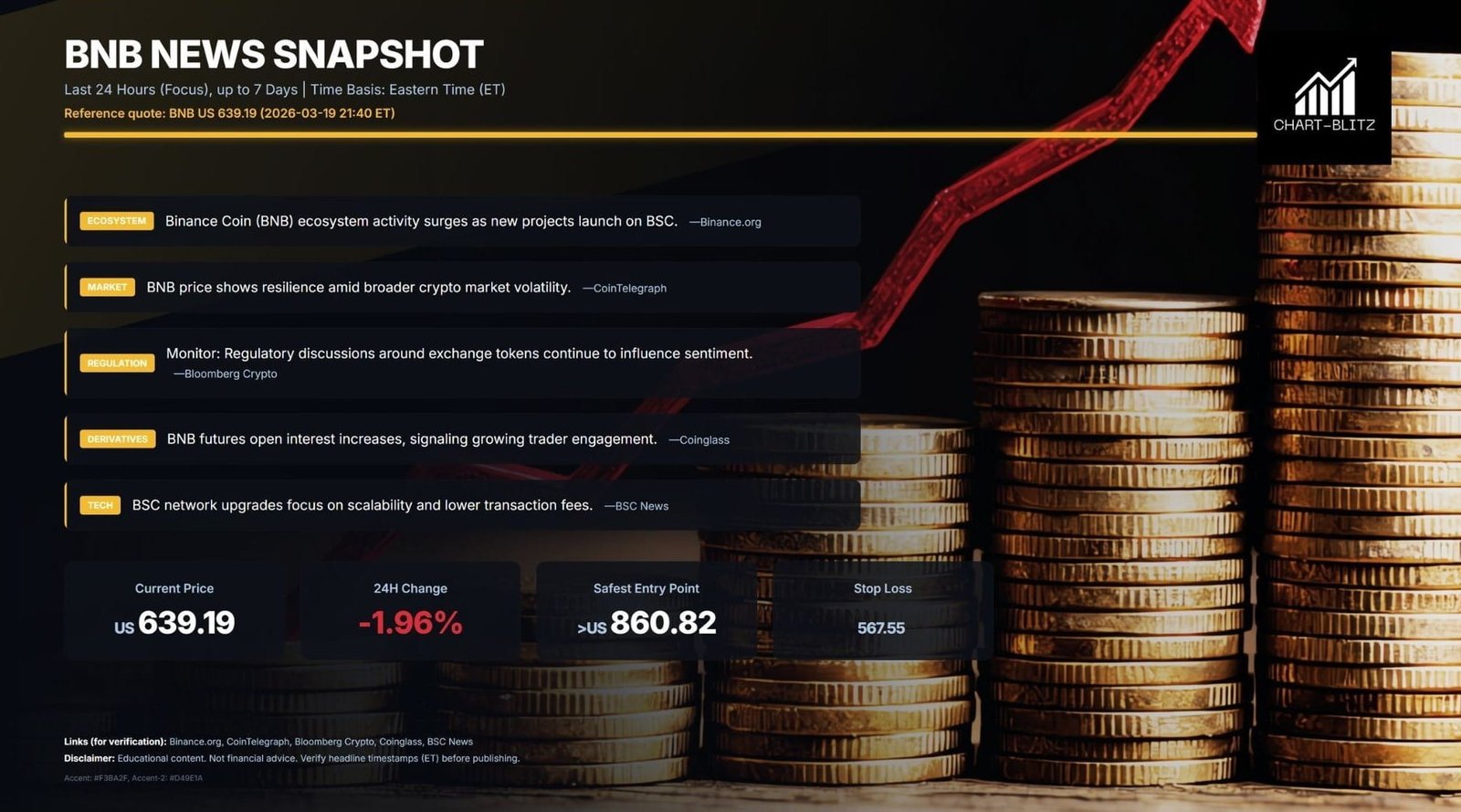 以下所有技術分析,均基於 2026年3月19日 09:00 EST 鎖定之價格快照:BNB = 639.19 USD。請將此報告視為「分析地圖」而非實時報價。
