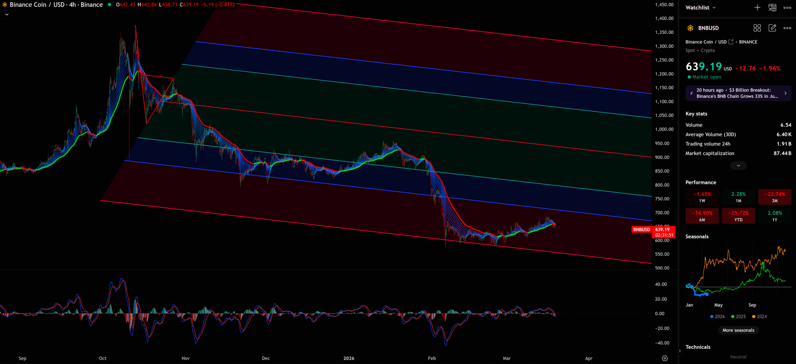 從 4 小時圖上,我們可以清晰地看到一個下降平行通道。通道的上軌(紅色)和下軌(紅色)清晰可見,BNB 的價格在通道內有序地下跌。目前,價格正在通道的下方區域附近運行,這意味著短線可能出現技術性反彈。