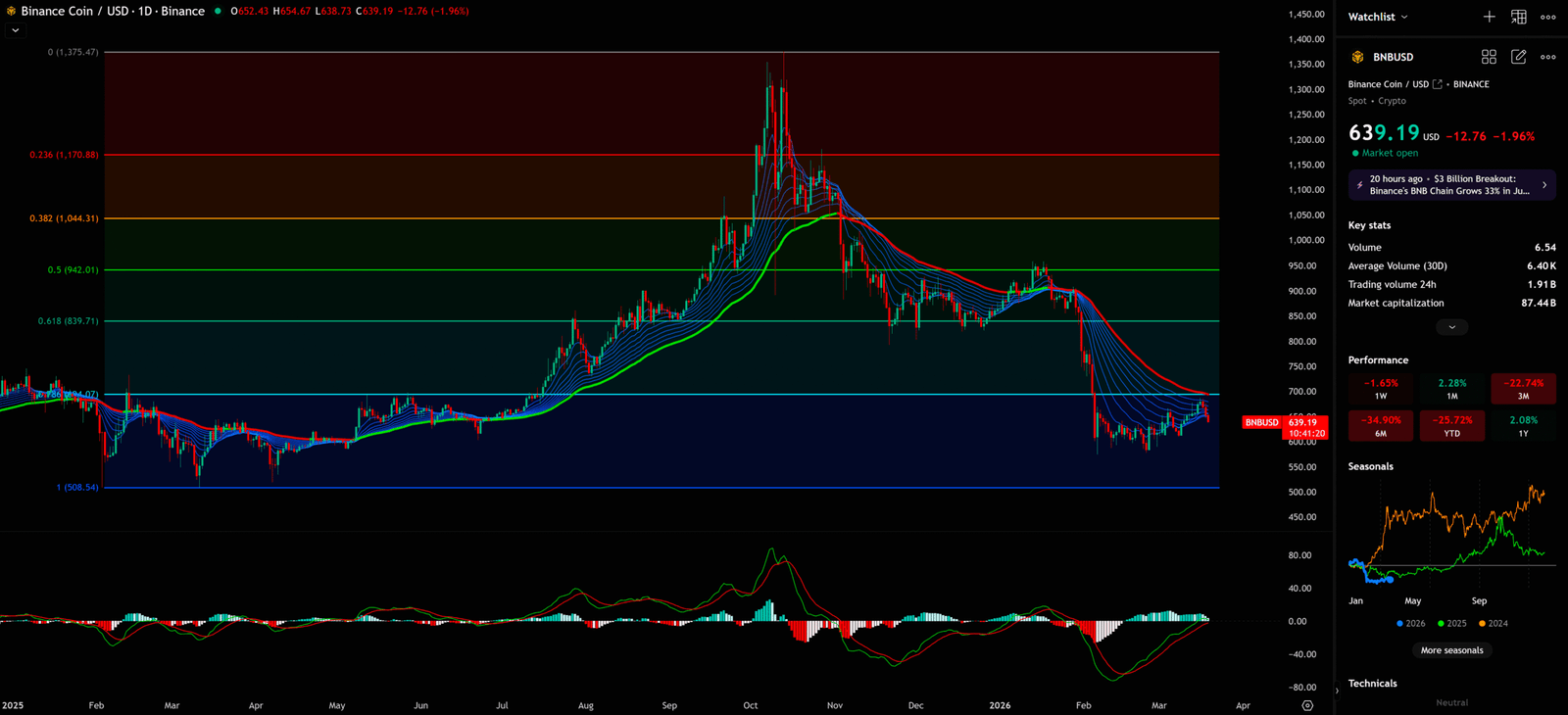 目前 BNB 的價格 $639.19 正處於 61.8% 回撤位 ($839.71) 與 100% 底部 ($508.54) 之間的區域。這個位置的技術意義在於:61.8% 的黃金分割位是強力阻力,而 100% 的底部是最後的防線。如果 BNB 無法突破 61.8% 阻力,下一個目標可能就是 $508.54。