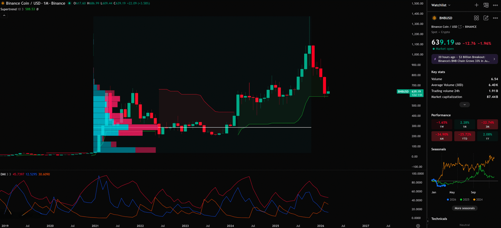 月線圖上顯示的 Supertrend 指標(設定為 10, 3)目前讀數為 $588.53,並且指標顏色顯示為看跌(紅色)。Supertrend 是一個趨勢跟蹤指標,當價格在指標線之下時,代表整體趨勢偏空。目前 BNB 的月線 Supertrend 確認了中長線的下降趨勢。