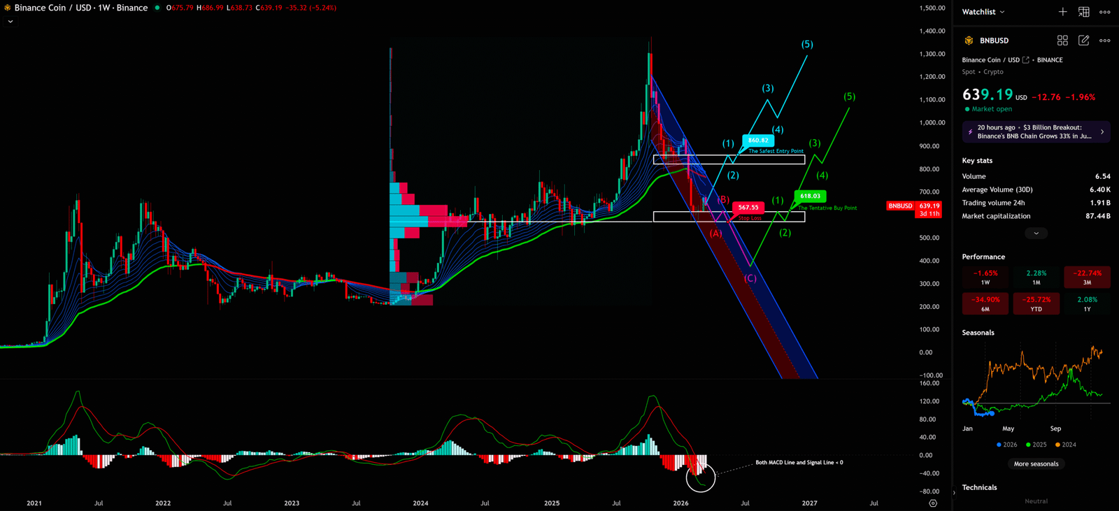 圖表上標記的 $618.03 被標注為「The Tentative Buy Point」(試探性買入點),這正好位於真空地帶的上方邊緣。這個位置的重要性在於:如果 BNB 能夠在這個水平企穩,並配合成交量的放大,那麼這可能就是莊家完成吸籌、準備拉升的信號。