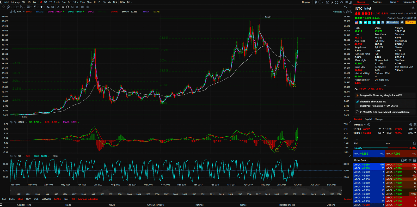 睇住張月線圖。唔好眨眼。 你見到 Intel 過去幾年跌到阿媽都唔認得,由歷史高位 $60幾蚊插落嚟。好多人喺 $40 接刀,死咗;喺 $30 接刀,又死咗。點解?因為佢哋唔識 Fibonacci。