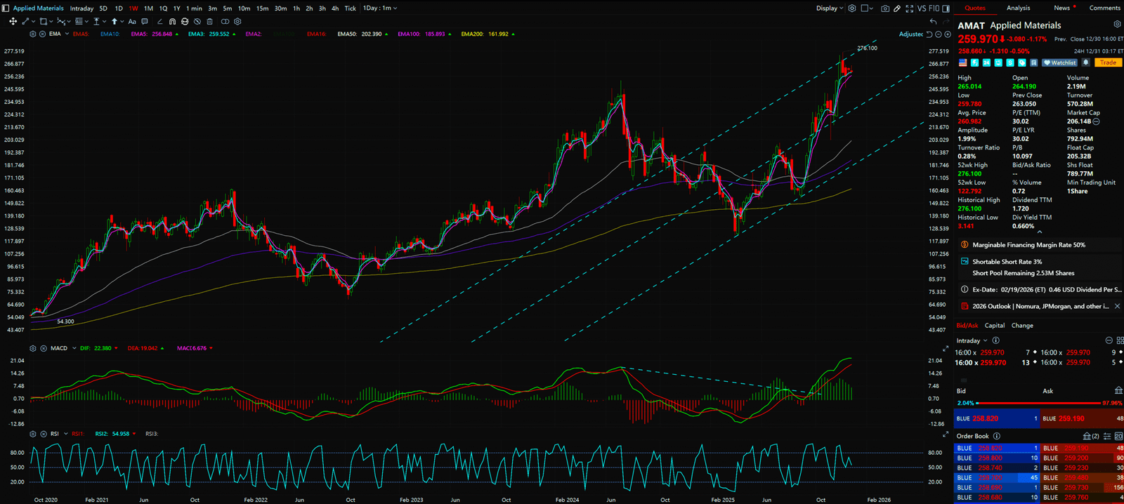 - 圖表解碼: TSM 圖表極其強勢。它突破了歷史新高後,正在進行回踩。均線系統呈現完美的多頭排列。