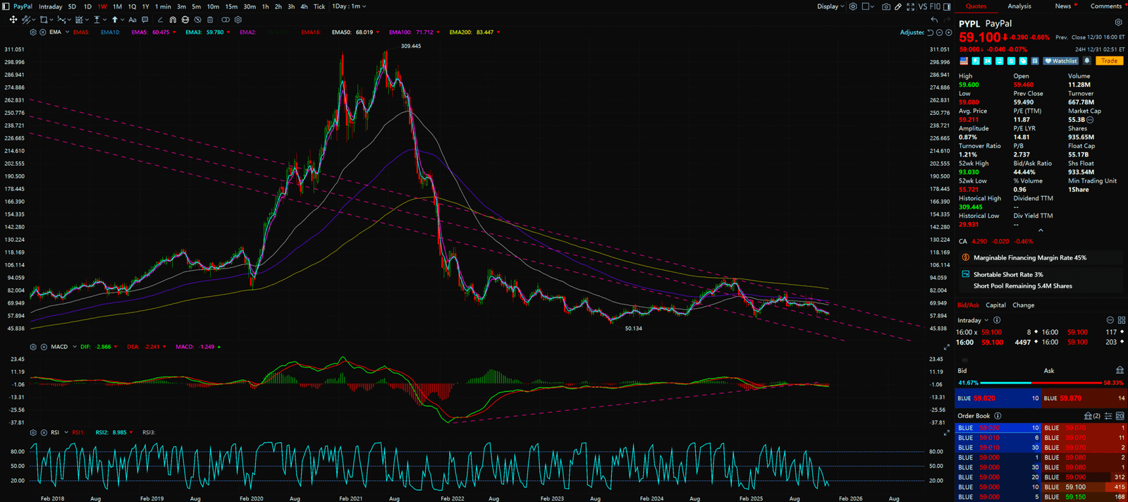 - 圖表解碼: PYPL 被稱為「價值陷阱」好耐。但圖表顯示佢喺 55−60 區間做咗個堅實嘅 Double Bottom。RSI 出現 Bullish Divergence (底背馳)——股價創新低,RSI 抬高,代表沽壓耗盡。