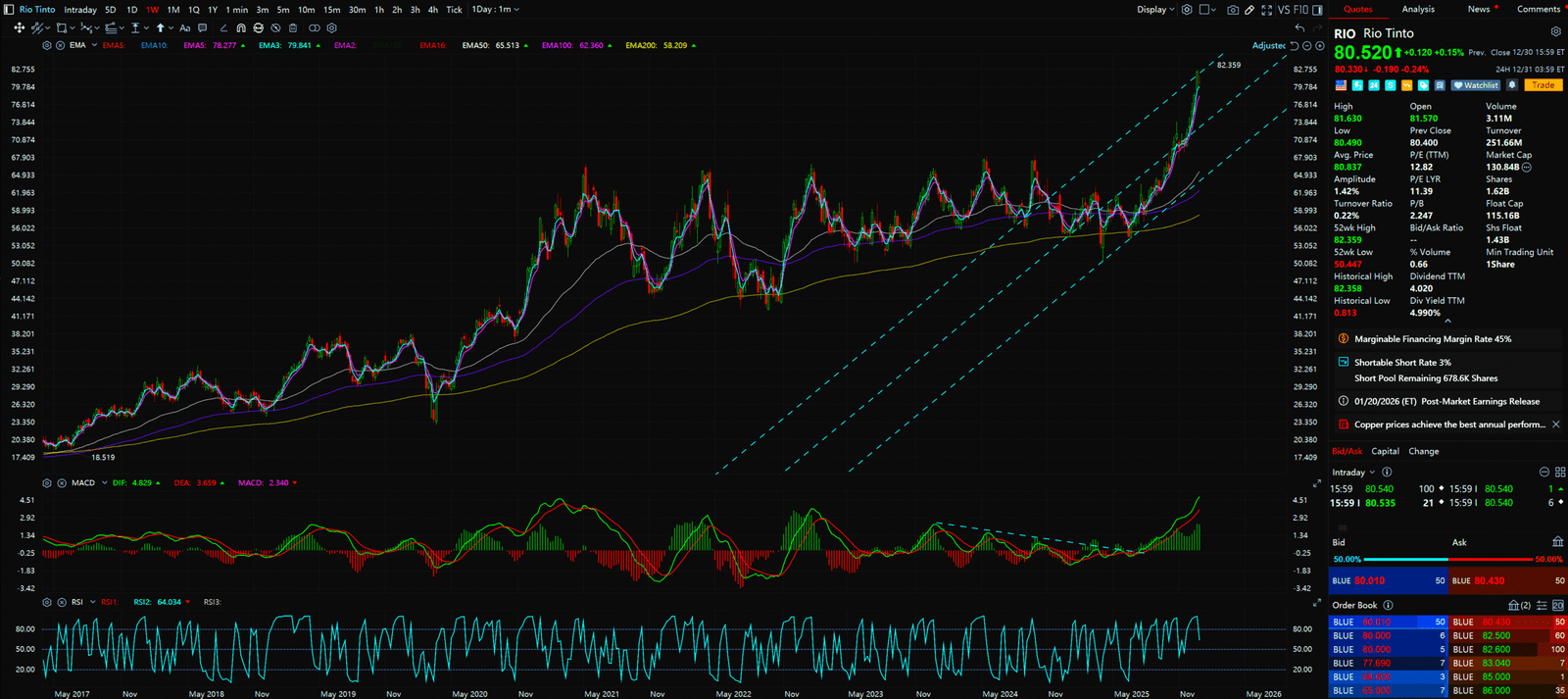 - 圖表解碼: RIO 走勢較穩,受鐵礦石影響。圖表顯示它正在突破長期震盪區間。